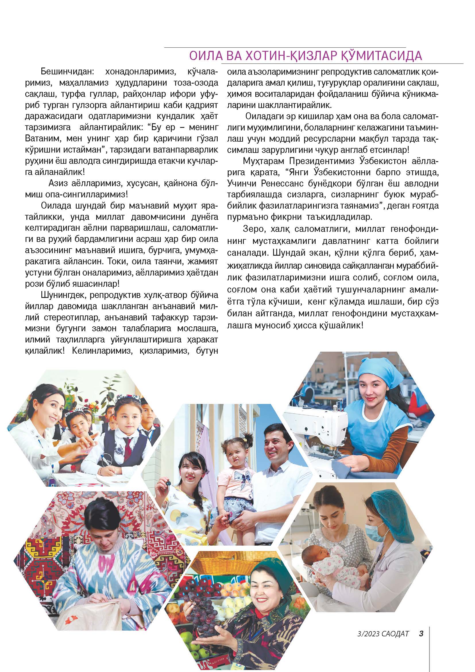 Муҳтарам Президентимиз Ўзбекистон аёлларига қарата, “Янги Ўзбекистонни барпо этишда, Учинчи Ренессанс бунёдкори бўлган ёш авлодни тарбиялашда сизларга, сизларнинг буюк мураббийлик фазилатларингизга таянамиз”, деган ғоятда пурмаъно фикрни таъкидладилар.