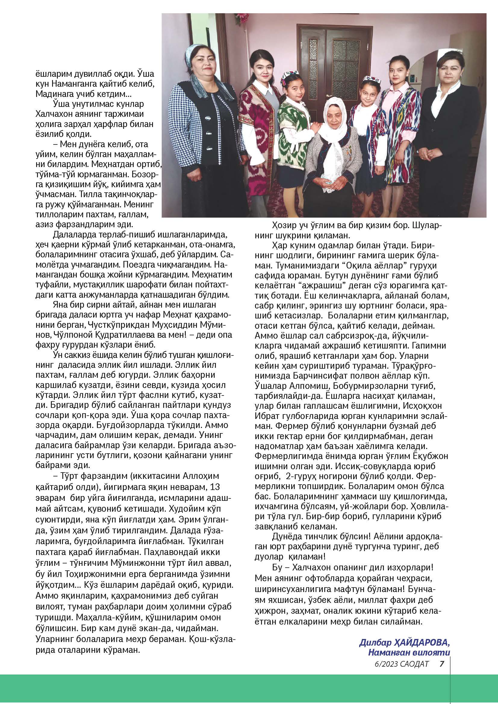 – Тўрт фарзандим (иккитасини Аллоҳим қайтариб олди), йигирмага яқин неварам, 13 эварам бир уйга йиғилганда, исмларини адашмай айтсам, қувониб кетишади. Худойим кўп суюнтирди, яна кўп йиғлатди ҳам. Эрим ўлганда, ўзим ҳам ўлиб тирилгандим. Далада ғўзаларимга, буғдойларимга йиғлабман. Тўкилган пахтага қараб йиғлабман. Паҳлавондай икки ўғлим – тўнғичим Мўминжонни тўрт йил аввал, бу йил Тоҳиржонимни ерга берганимда ўзимни йўқотдим... Кўз ёшларим дарёдай оқиб, қуриди. Аммо яқинларим, қаҳрамонимиз деб суйган вилоят, туман раҳбарлари доим ҳолимни сўраб туришди. Маҳалла-кўйим, қўшниларим омон бўлишсин. Бир кам дунё экан-да, чидайман. Уларнинг болаларига меҳр бераман. Қош-кўзларида оталарини кўраман.