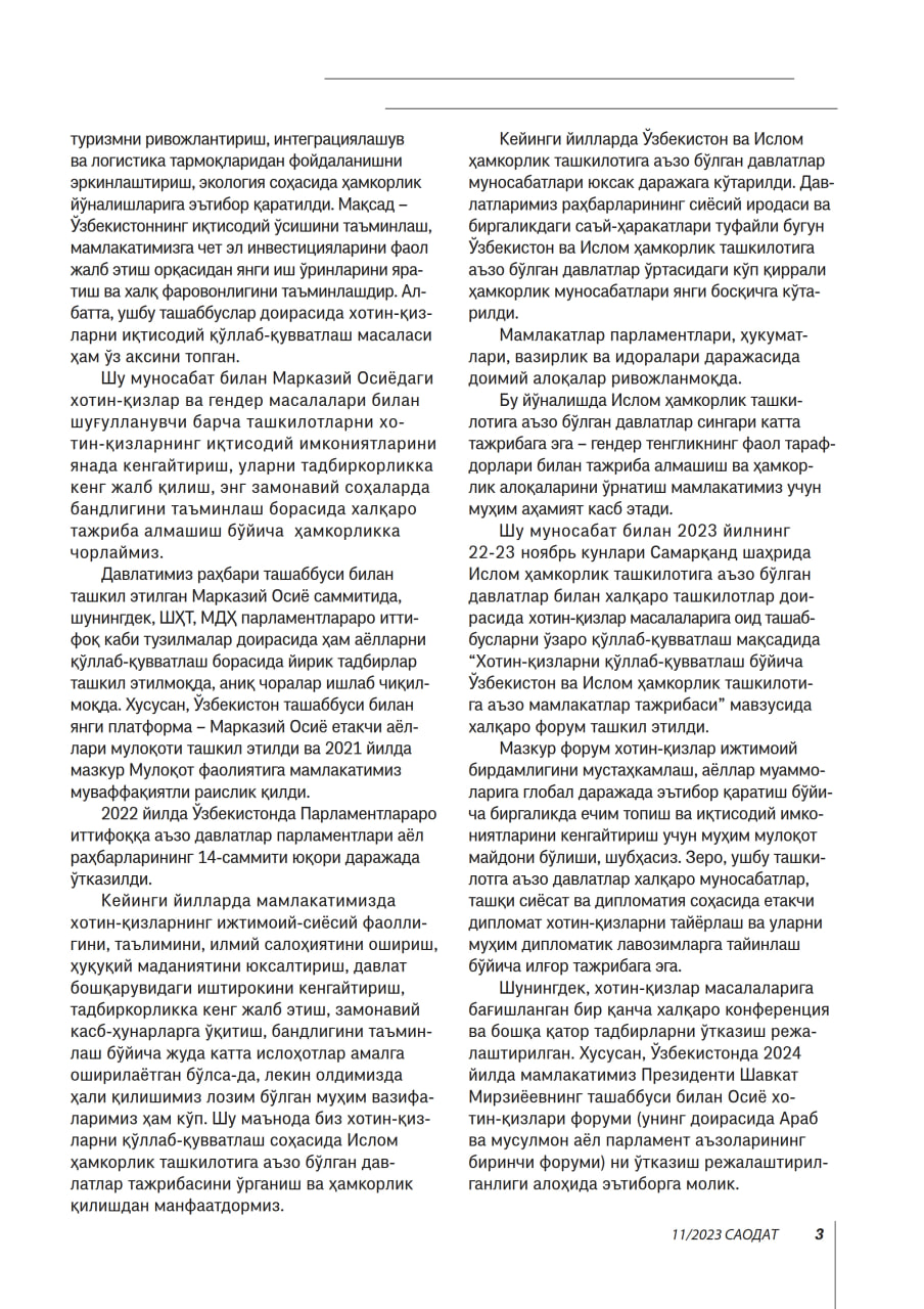 Шу муносабат билан 2023 йилнинг 22-23 ноябрь кунлари Самарқанд шаҳрида Ислом ҳамкорлик ташкилотига аъзо бўлган давлатлар билан халқаро ташкилотлар доирасида хотин-қизлар масалаларига оид ташаббусларни ўзаро қўллаб-қувватлаш мақсадида “Хотин-қизларни қўллаб-қувватлаш бўйича Ўзбекистон ва Ислом ҳамкорлик ташкилотига аъзо мамлакатлар тажрибаси” мавзусида халқаро форум ташкил этилди.