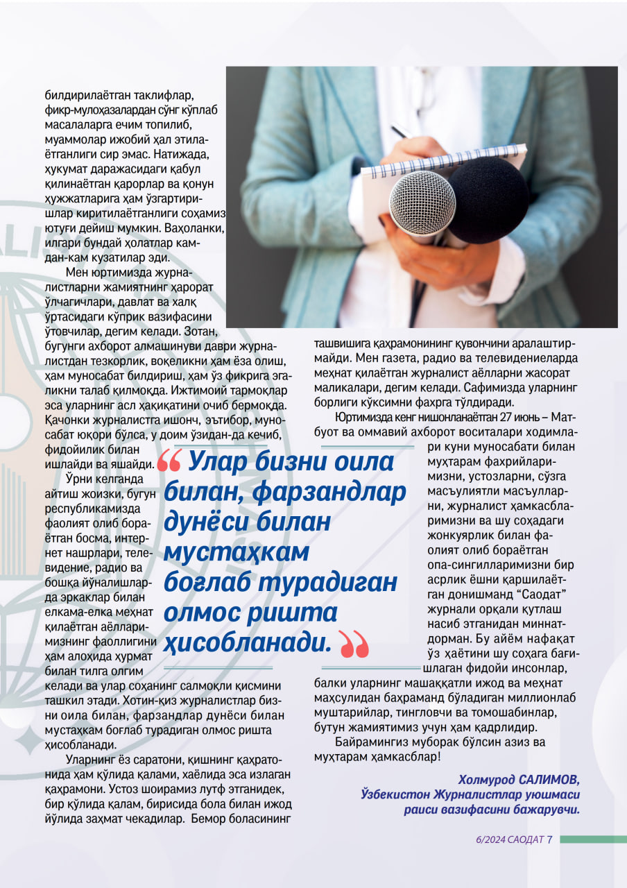Юртимизда кенг нишонланаётган 27 июнь – Матбуот ва оммавий ахборот воситалари ходимлари куни муносабати билан муҳтарам фахрийларимизни, устозларни, сўзга масъулиятли масъулларни, журналист ҳамкасбларимизни ва шу соҳадаги жонкуярлик билан фаолият олиб бораётган опа-сингилларимизни бир асрлик ёшни қаршилаётган донишманд “Саодат” журнали орқали қутлаш насиб этганидан миннатдорман. Бу айём нафақат ўз ҳаётини шу соҳага бағишлаган фидойи инсонлар, балки уларнинг машаққатли ижод ва меҳнат маҳсулидан баҳраманд бўладиган миллионлаб муштарийлар, тингловчи ва томошабинлар, бутун жамиятимиз учун ҳам қадрлидир.