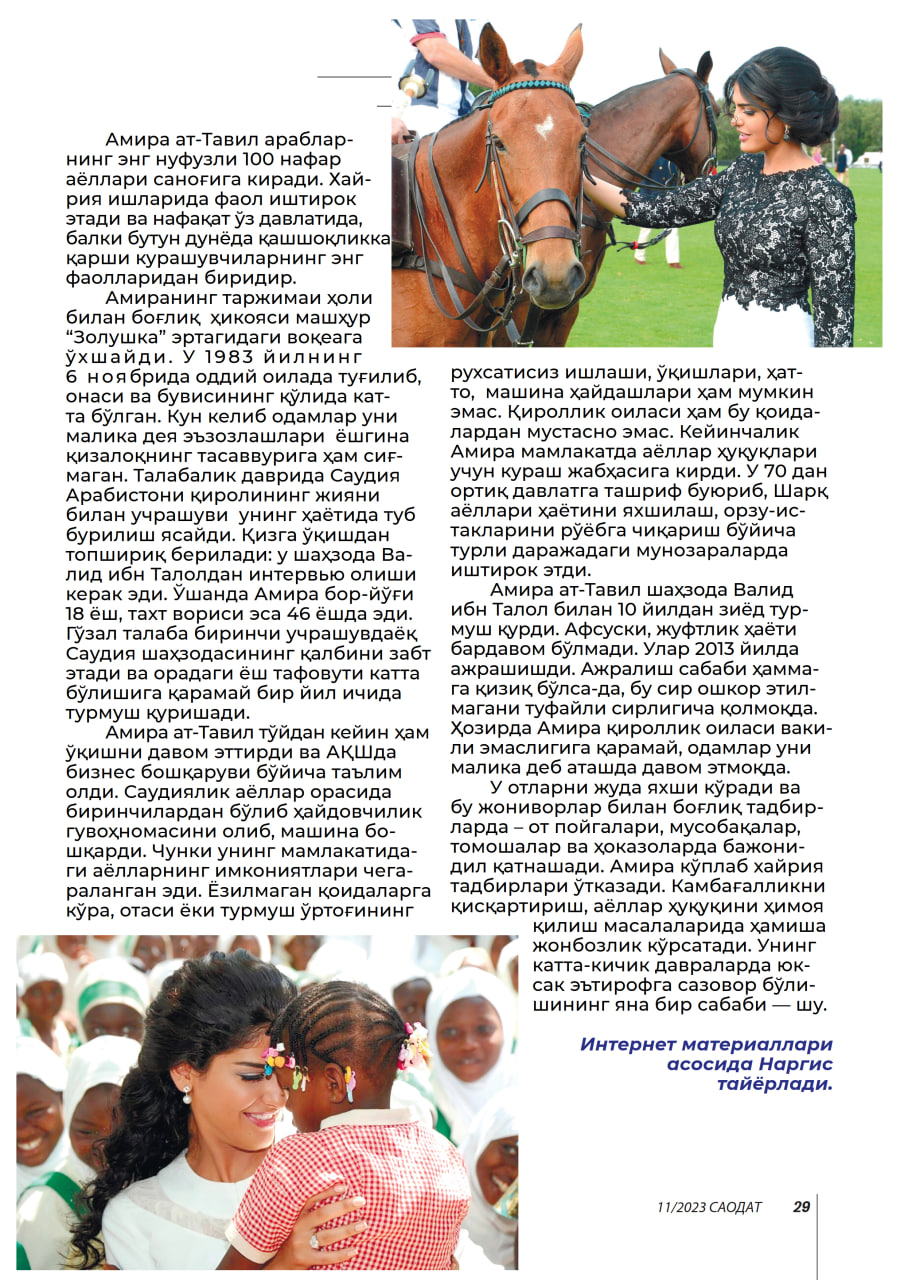У отларни жуда яхши кўради ва бу жониворлар билан боғлиқ тадбирларда – от пойгалари, мусобақалар, томошалар ва ҳоказоларда бажонидил қатнашади. Амира кўплаб хайрия тадбирлари ўтказади. Камбағалликни қисқартириш, аёллар ҳуқуқини ҳимоя қилиш масалаларида ҳамиша жонбозлик кўрсатади. Унинг катта-кичик давраларда юксак эътирофга сазовор бўлишининг яна бир сабаби — шу.