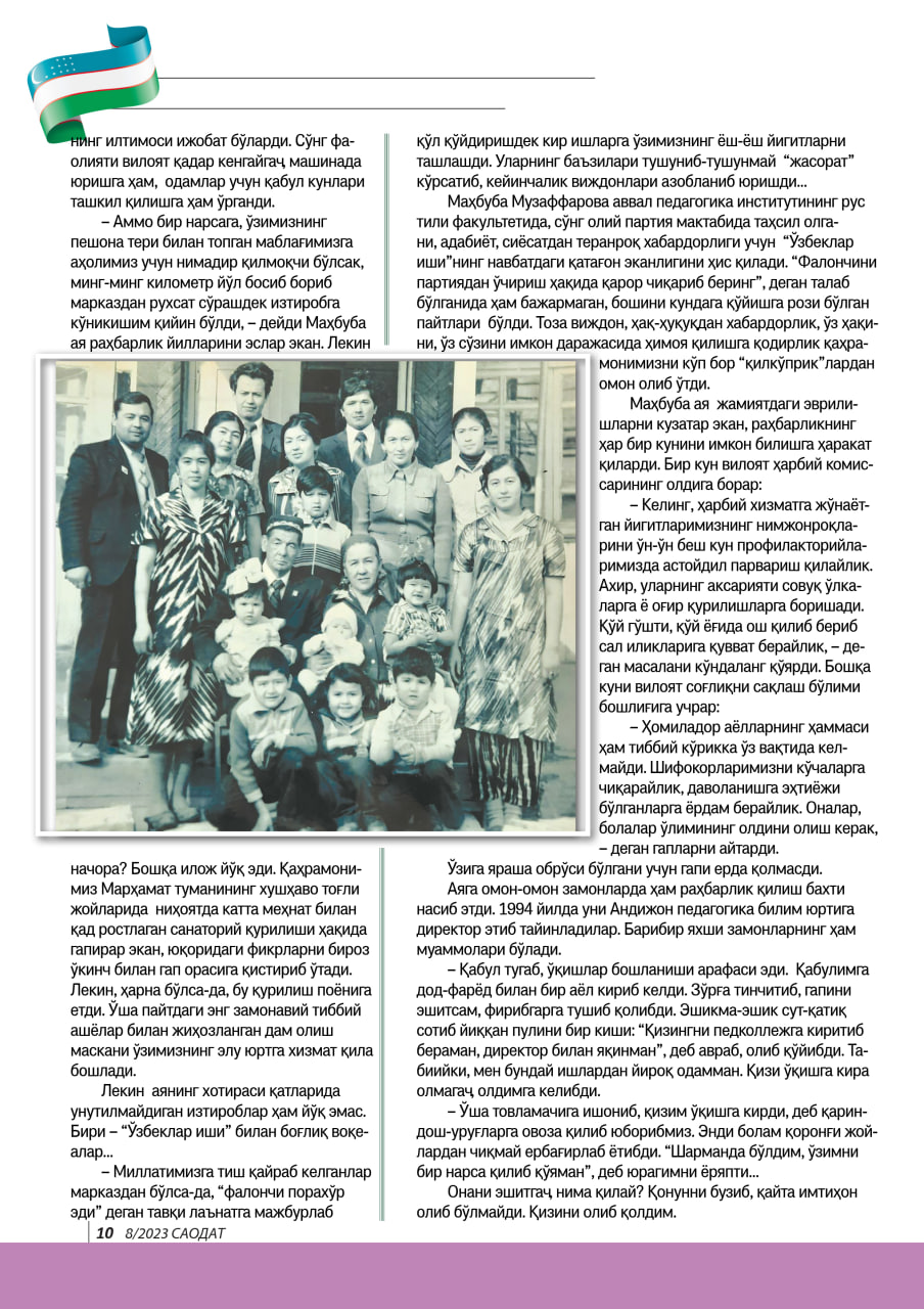– Аммо бир нарсага, ўзимизнинг пешона тери билан топган маблағимизга аҳолимиз учун нимадир қилмоқчи бўлсак, минг-минг километр йўл босиб бориб марказдан рухсат сўрашдек изтиробга кўникишим қийин бўлди, – дейди Маҳбуба ая раҳбарлик йилларини эслар экан. Лекин начора? Бошқа илож йўқ эди. Қаҳрамонимиз Марҳамат туманининг хушҳаво тоғли жойларида ниҳоятда катта меҳнат билан қад ростлаган санаторий қурилиши ҳақида гапирар экан, юқоридаги фикрларни бироз ўкинч билан гап орасига қистириб ўтади. Лекин, ҳарна бўлса-да, бу қурилиш поёнига етди. Ўша пайтдаги энг замонавий тиббий ашёлар билан жиҳозланган дам олиш маскани ўзимизнинг элу юртга хизмат қила бошлади.