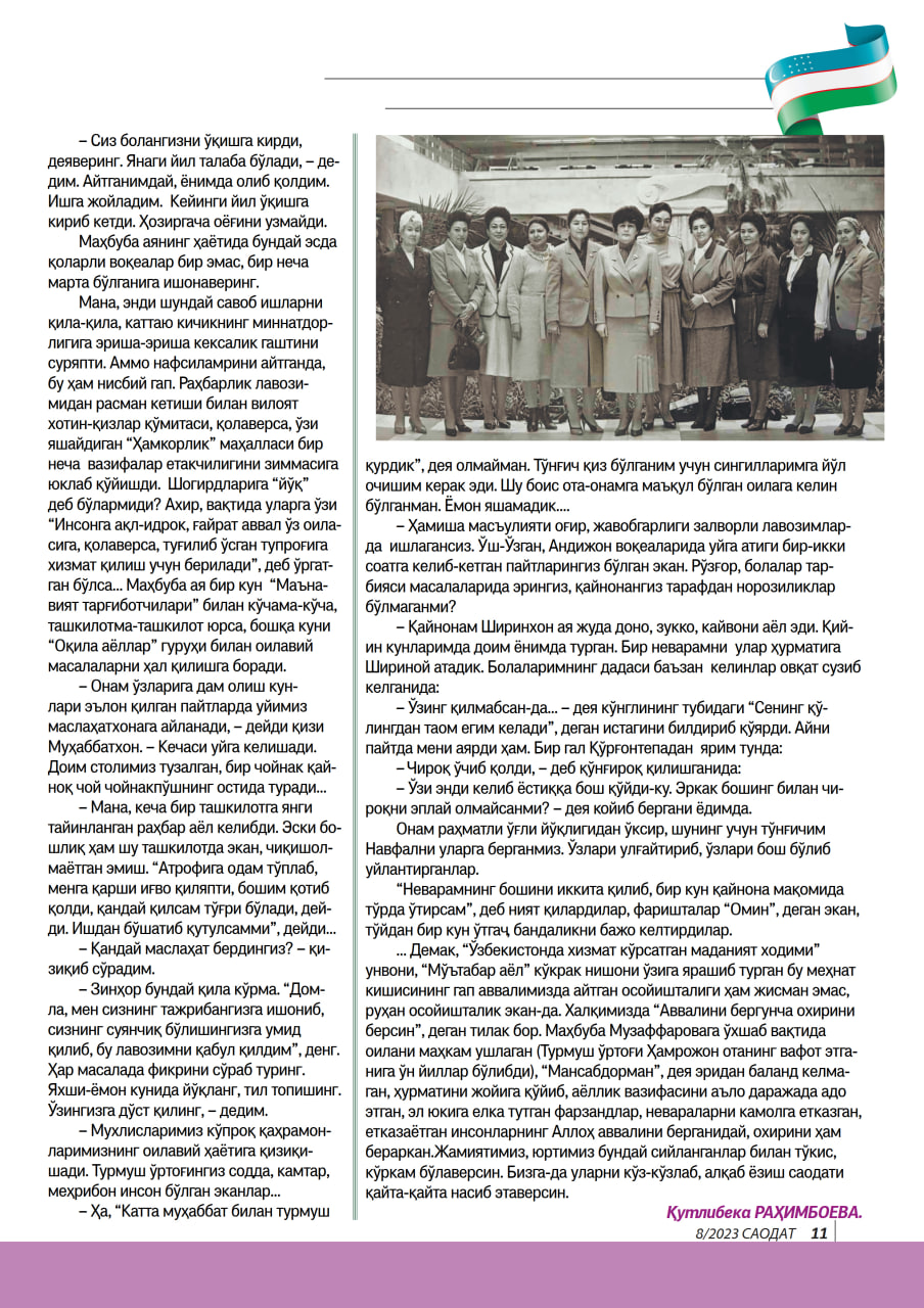 Мана, энди шундай савоб ишларни қила-қила, каттаю кичикнинг миннатдорлигига эриша-эриша кексалик гаштини суряпти. Аммо нафсиламрини айтганда, бу ҳам нисбий гап. Раҳбарлик лавозимидан расман кетиши билан вилоят хотин-қизлар қўмитаси, қолаверса, ўзи яшайдиган “Ҳамкорлик” маҳалласи бир неча вазифалар етакчилигини зиммасига юклаб қўйишди. Шогирдларига “йўқ” деб бўлармиди? Ахир, вақтида уларга ўзи “Инсонга ақл-идрок, ғайрат аввал ўз оиласига, қолаверса, туғилиб ўсган тупроғига хизмат қилиш учун берилади”, деб ўргатган бўлса... Маҳбуба ая бир кун “Маънавият тарғиботчилари” билан кўчама-кўча, ташкилотма-ташкилот юрса, бошқа куни “Оқила аёллар” гуруҳи билан оилавий масалаларни ҳал қилишга боради.