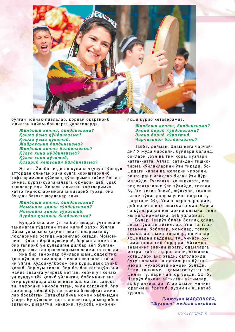 Ўша куни апил-тапил чойларимизни ичиб, энам тиккан пошшойи кўйлакларимиз, ироқи дўппиларимизни кийиб ясаниб оламиз. Акаларим энам йўрмалаган шоҳи белбоғларини бойлаб олишади. Отам бошчилигида қишлоғимизнинг ўртасида қад кўтарган “Маслаҳат тепа”га йўл оламиз. Бу кўҳна ва қадимий, бир замонлар босқинчи дориганда ёки қишлоққа Ногаҳон томондан сел ёпирилганда одамларга бошпана вазифасини бажарган тепаликда эл Наврўз тантанасига йиғилади. Кечгача давом этган ўйин-кулги, ҳазил аралаш меҳмондорчилик ниҳоят Алимардон бобом дуосидан сўнг тугалланади.