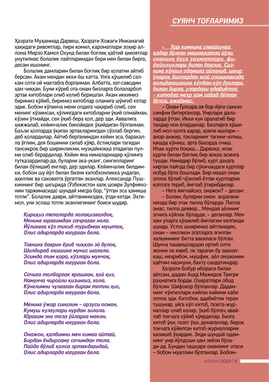 Мен ҳам фурсатдан фойдаланиб "Саодат" журналини севиб ўқийдиган барча оналаримиз, опа-сингилларимизга онамнинг шу гўзал тилакларини такрорлагим келади.