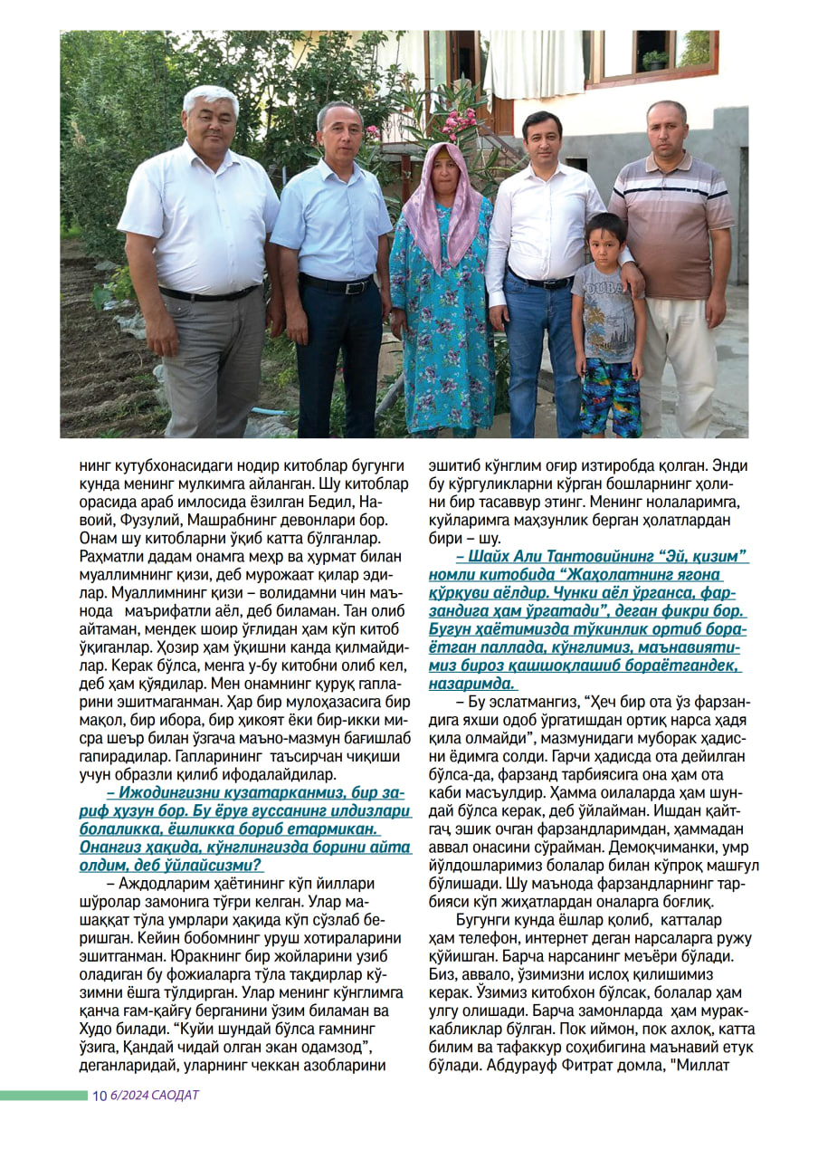 Бугунги кунда ёшлар қолиб, катталар ҳам телефон, интернет деган нарсаларга ружу қўйишган. Барча нарсанинг меъёри бўлади. Биз, аввало, ўзимизни ислоҳ қилишимиз керак. Ўзимиз китобхон бўлсак, болалар ҳам улгу олишади. Барча замонларда ҳам мураккабликлар бўлган. Пок иймон, пок ахлоқ, катта билим ва тафаккур соҳибигина маънавий етук бўлади. Абдурауф Фитрат домла, "Миллат тақдири мана шу миллат вакиллари яшаган оиланинг ҳолатига боғлиқдир. Қаерда оила муносабати кучли интизомга таянса, мамлакат ва миллат ҳам шунча кучли ва тартибли бўлади”, деган эди. Бугуннинг одамлари бу ҳикматни чуқур англаб етишган ва оилага, фарзанд тарбиясига, илму маърифат эгаси бўлишга интилиб яшаяптилар.