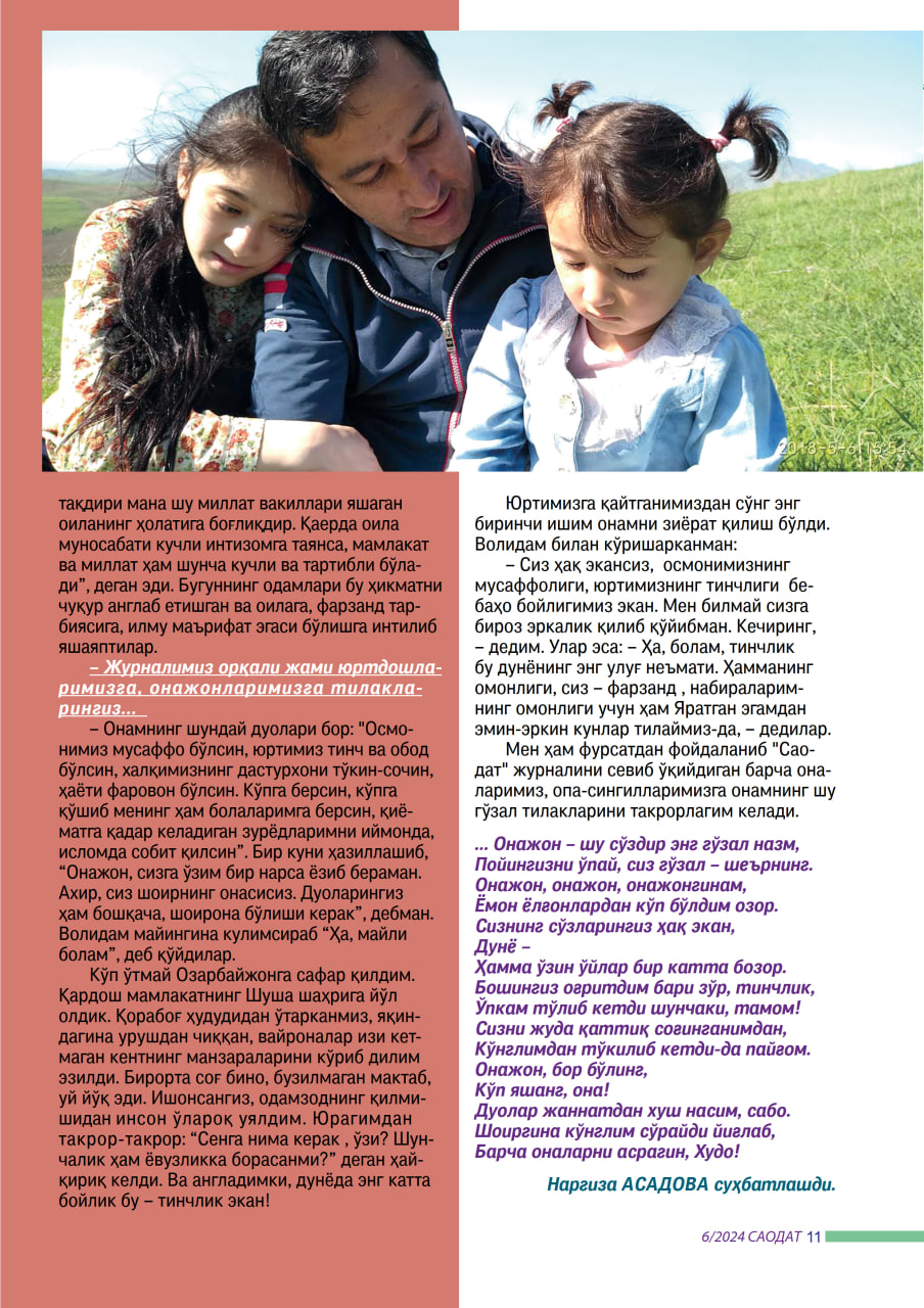 – Журналимиз орқали жами юртдошларимизга, онажонларимизга тилакларингиз...