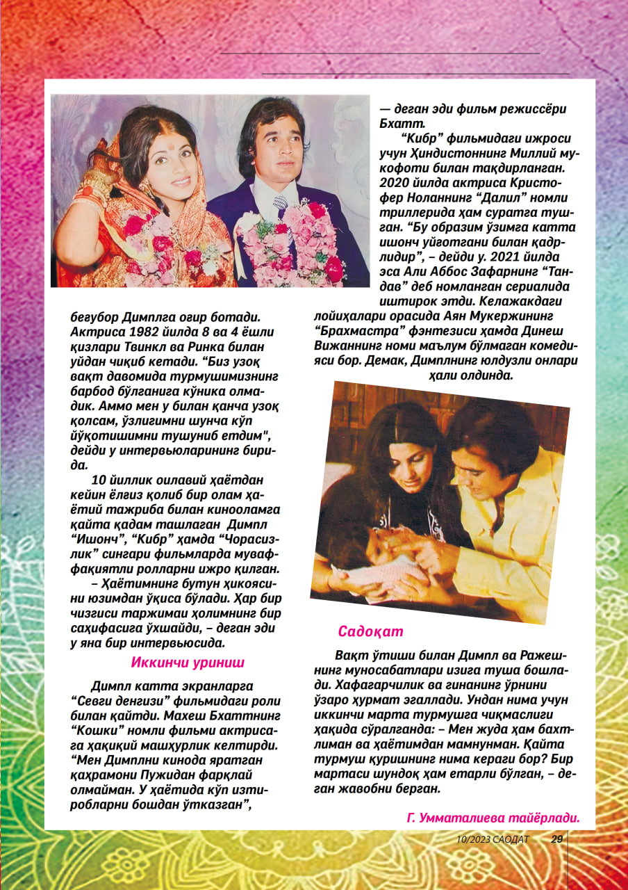 Ўзбек томошабинларининг севимли фильмлари қаторидан жой олган “Бобби”нинг финал саҳнасида ёш Димпл Кападиянинг қўлларидаги никоҳ хинасини яширишнинг иложи бўлмаган. Киноасар экран юзига чиқишидан аввалроқ бош қаҳрамон образини ижро этган ўсмир қизалоқ ўзидан 16 ёш катта бўлган Ражеш Кҳаннага турмушга чиқиб улгурган эди.