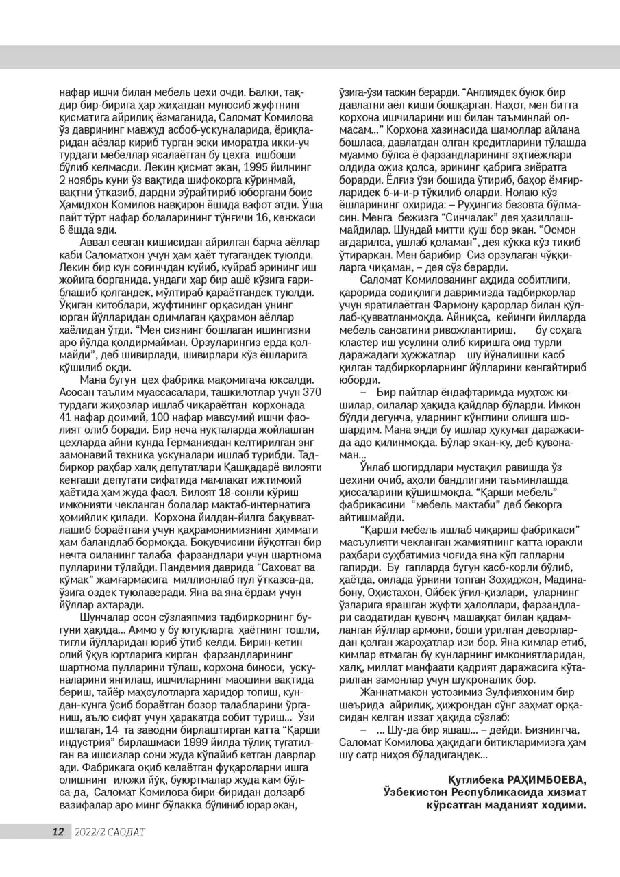 “Қарши мебель ишлаб чиқариш фабрикаси” масъулияти чекланган жамиятнинг катта юракли раҳбари суҳбатимиз чоғида яна кўп гапларни гапирди. Бу гапларда бугун касб-корли бўлиб, ҳаётда, оилада ўрнини топган Зоҳиджон, Мадинабону, Оҳистахон, Ойбек ўғил-қизлари, уларнинг ўзларига ярашган жуфти ҳалоллари, фарзандлари саодатидан қувонч, машаққат билан қадамланган йўллар армони, боши урилган деворлардан қолган жароҳатлар изи бор. Яна кимлар етиб, кимлар етмаган бу кунларнинг имкониятларидан, халқ, миллат манфаати қадрият даражасига кўтарилган замонлар учун шукроналик бор.