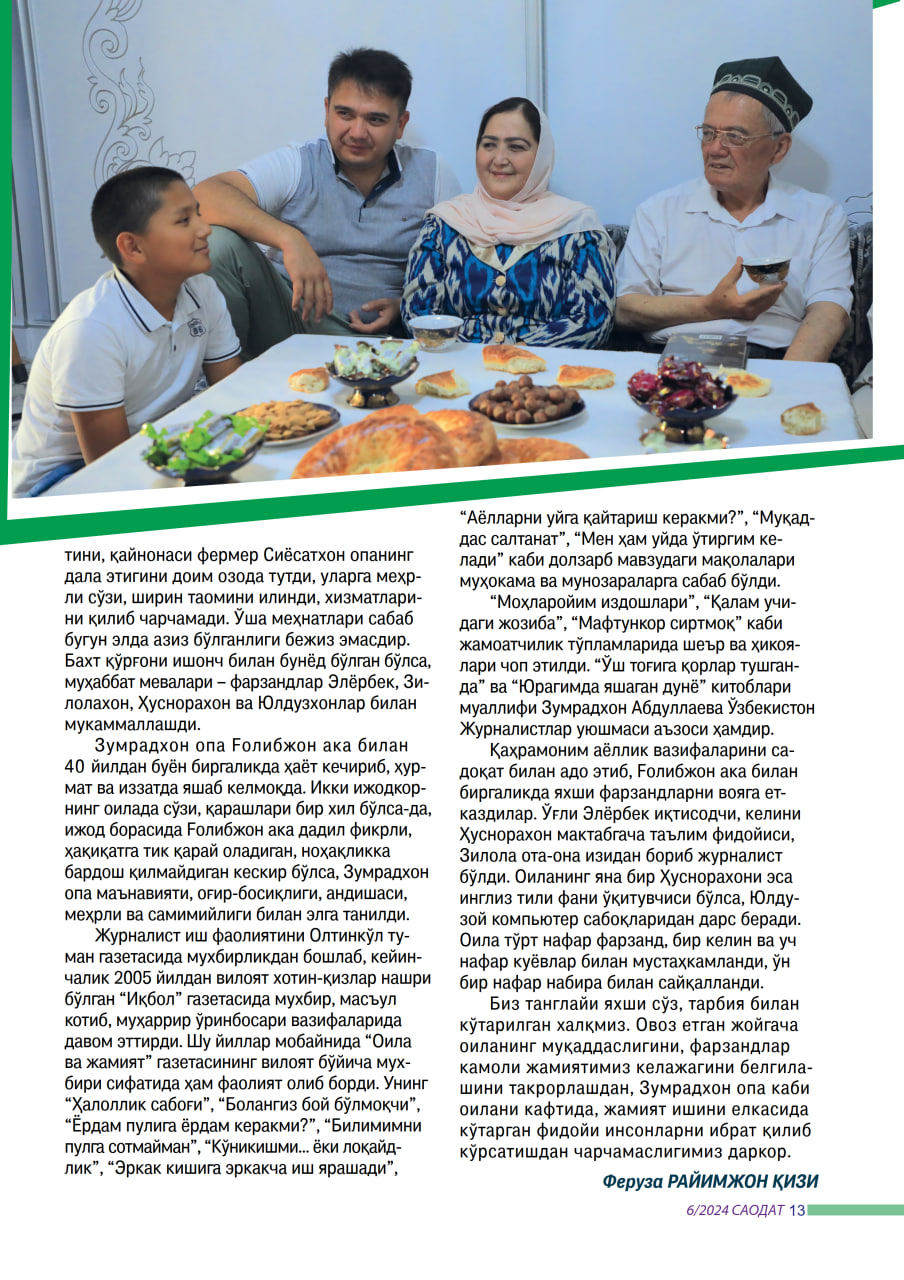 Биз танглайи яхши сўз, тарбия билан кўтарилган халқмиз. Овоз етган жойгача оиланинг муқаддаслигини, фарзандлар камоли жамиятимиз келажагини белгилашини такрорлашдан, Зумрадхон опа каби оилани кафтида, жамият ишини елкасида кўтарган фидойи инсонларни ибрат қилиб кўрсатишдан чарчамаслигимиз даркор.