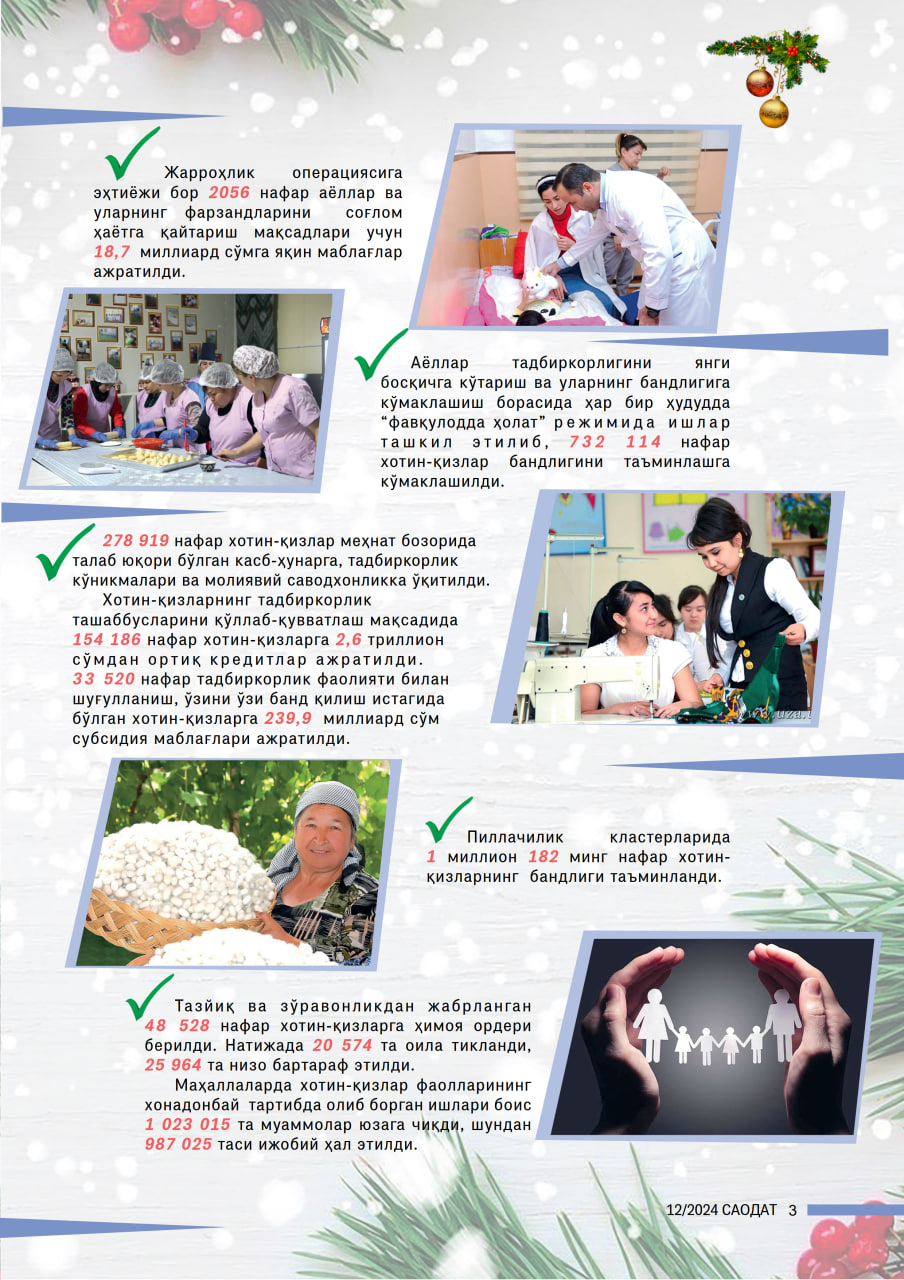 Йилларни кутиб, кузатиш билан боғлиқ ибратли анъаналар бор. Заҳматкаш қўлимиз, фидойи қалбимиздан қувват бериб яшаган кунларимизни йил якунида сарҳисоб қилиш бу ибратли анъаналардан бири ҳисобланади. Эътиборингизга ҳавола қилинаётган мазкур рақамларда мамлакатимизда оила ва хотин-қизларни қўллаб-қувватлаш йўналишида амалга оширилган кенг миқёсли ишлар кўзгудагидек аниқ ва равшан акс этади.