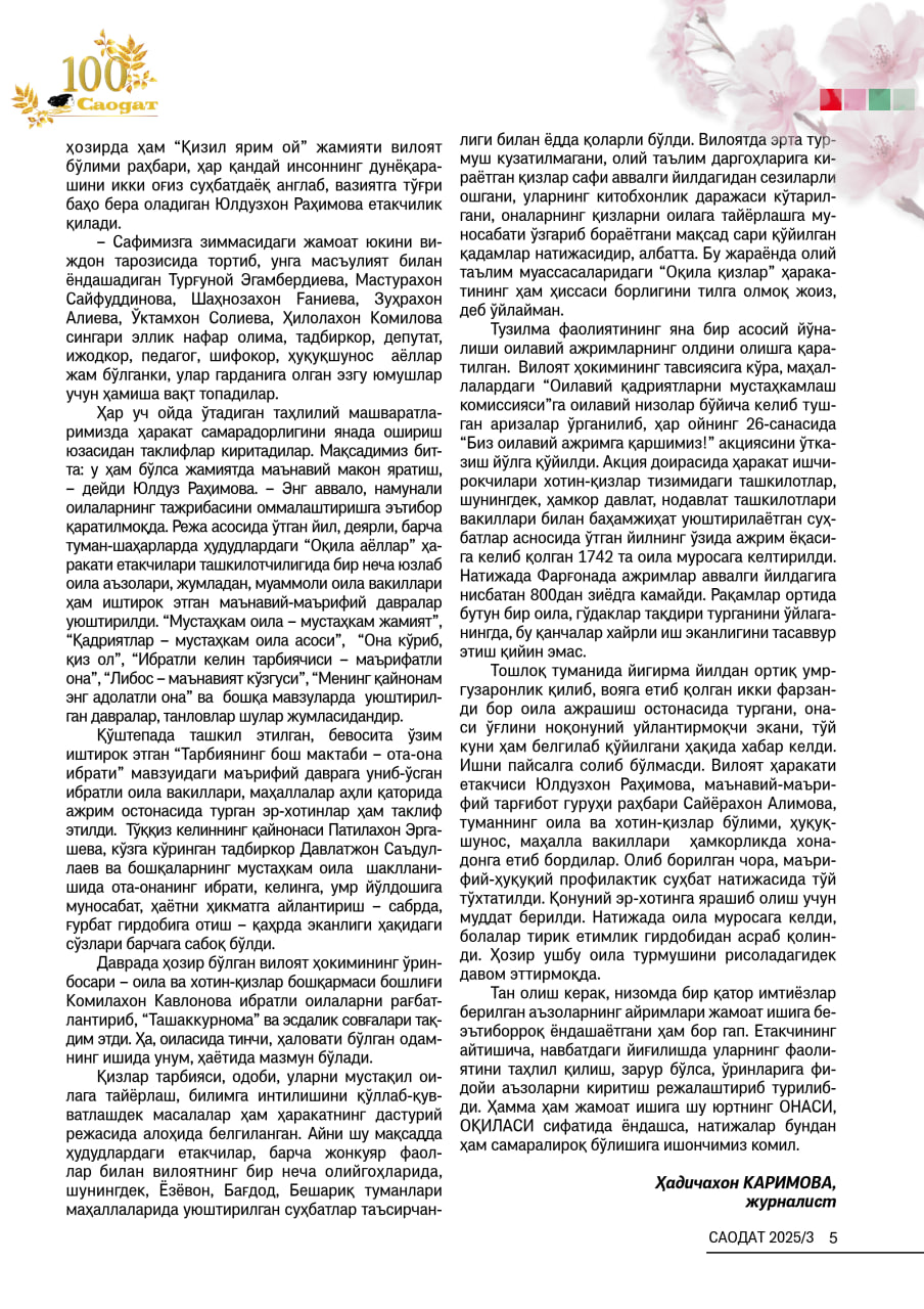 – Сафимизга зиммасидаги жамоат юкини виждон тарозисида тортиб, унга масъулият билан ёндашадиган Турғуной Эгамбердиева, Мастурахон Сайфуддинова, Шаҳнозахон Ғаниева, Зуҳрахон Алиева, Ўктамхон Солиева, Ҳилолахон Комилова сингари эллик нафар олима, тадбиркор, депутат, ижодкор, педагог, шифокор, ҳуқуқшунос аёллар жам бўлганки, улар гарданига олган эзгу юмушлар учун ҳамиша вақт топадилар.