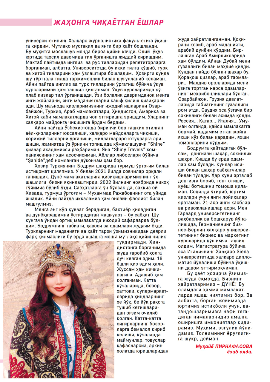Шоҳида Юсупова – Хоразм қизи. У дунёнинг тўрт тарафига бориб-келиб, маданий алоқалар ривожига камарбаста бўлиш иштиёқида. Йўлларингиз ҳамиша равон бўлсин!