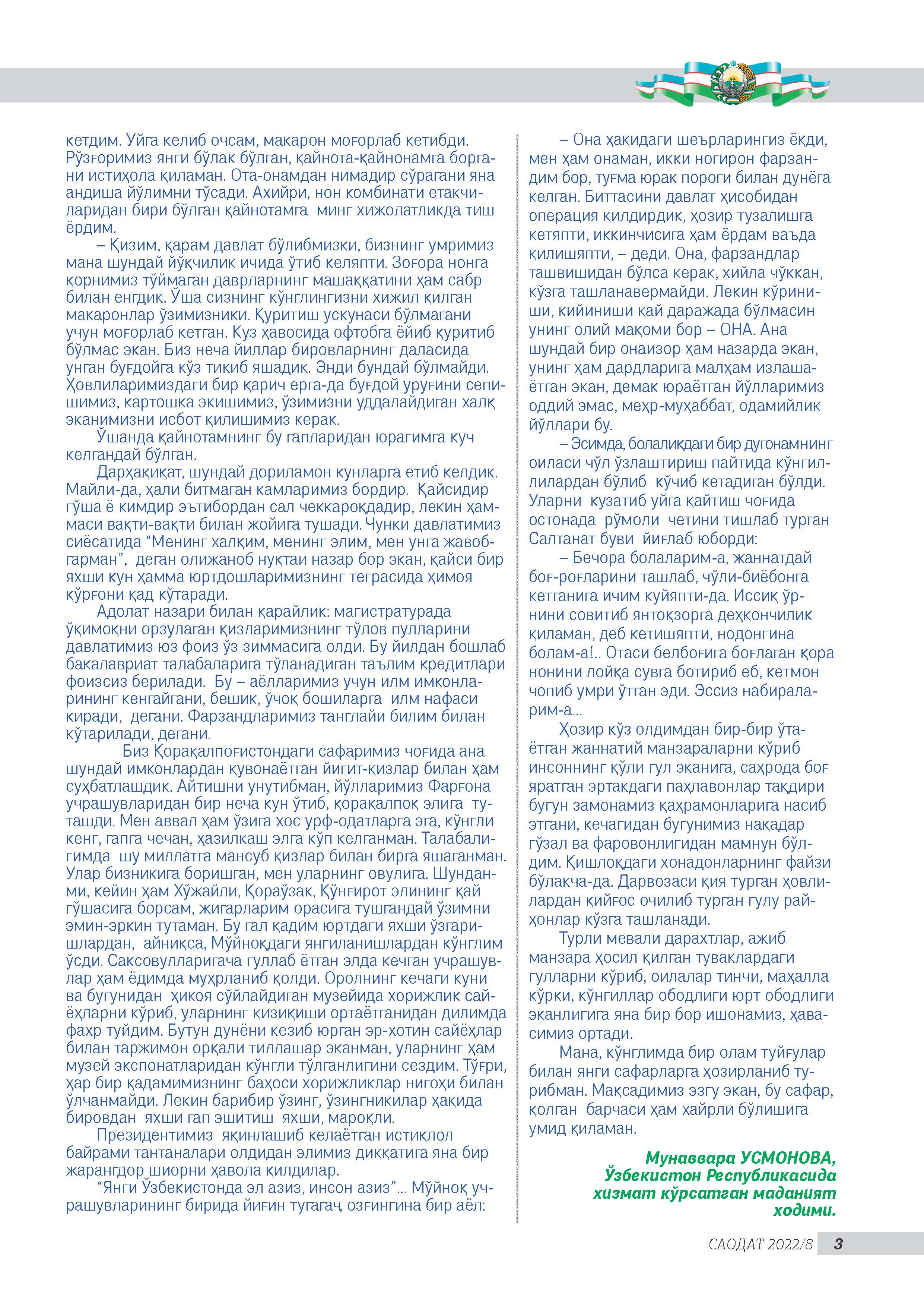 Одамнинг кайфияти яхши бўлмаса, уйидан чиққиси келмайди. Аммо кўксини соғинчли, ғурурли, курашчан туйғулар тўлдириб турса, кўзига йўл кўринаверади. Мен ҳам кейинги пайтларда эртакларда айтилгандек, “йўл юрдим, йўл юрсам ҳам мўл юрдим”. Гап аввалида айтиб ўтиш жоизки, гоҳ обод қишлоқлар, гоҳ чўл, даштлар, баъзан эса тоғу даралар аро кечаётган сафарларимиз мамлакатимиз раҳбарининг ташаббуси билан эътиборимизга ҳавола этилаётган “Янги Ўзбекистонда эл азиз, инсон азиз” шиорининг ҳаётга, ҳақиқатга кўчаётгани билан боғлиқ. Ўрни келганда эслаб ўтиш жоизки, бир пайтлар чиройли шиорлар фақат иморатларнинг пештоқларида ярқираб турарди, холос. Баҳор, куз ёмғирлари ювиб, қиш аёзлари ялаб, саратон оловлари куйдириб, турган жойларида ранги ўнгиб ё титилиб кетарди ҳамки, кимнингдир ҳаётига кира олмасди. Одамлар унга “нарса” деб қарашар эди. Бизнинг давримизга, айнан ҳозирги кунларимизга келиб давлатимиз сиёсатининг ўқ томирига ай ланган шиорлар кенг кўламли ҳаракатга, фаолиятга айланиб улгурди.
