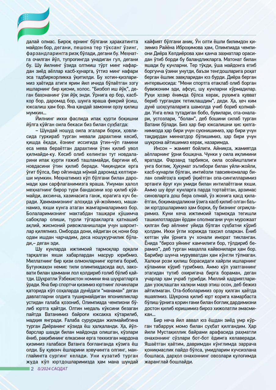 Қайси мавзуда сўз очсам ҳам кўнглим кенгликларида етарлича куч борга ўхшайди, лекин барибир қаламим ўзига қадрдон мавзуси томон ўрмалайверади. Яна аёл, она ҳақидаги сатрлар (негадир) қуйила бошлайди. Гул-райҳон экилган кўчага сув сепиб, қўшни аёл билан гурунг қилиб турган навниҳол келинчакка ҳавас билан қарайман. Ҳосилга кирган боғларни кўриб, мана шу руҳимизни шодликка ўраётган олам – юртимиздаги барча чиройли ўзгаришлар, инсон тафаккури, ҳаракати ва унинг қўли билан бунёд бўлганини фикрласак, руҳий улуғлик вужудимизни қамраб ўзимиз ҳам тобора юксалиб бораётганимизни ҳис этамиз.