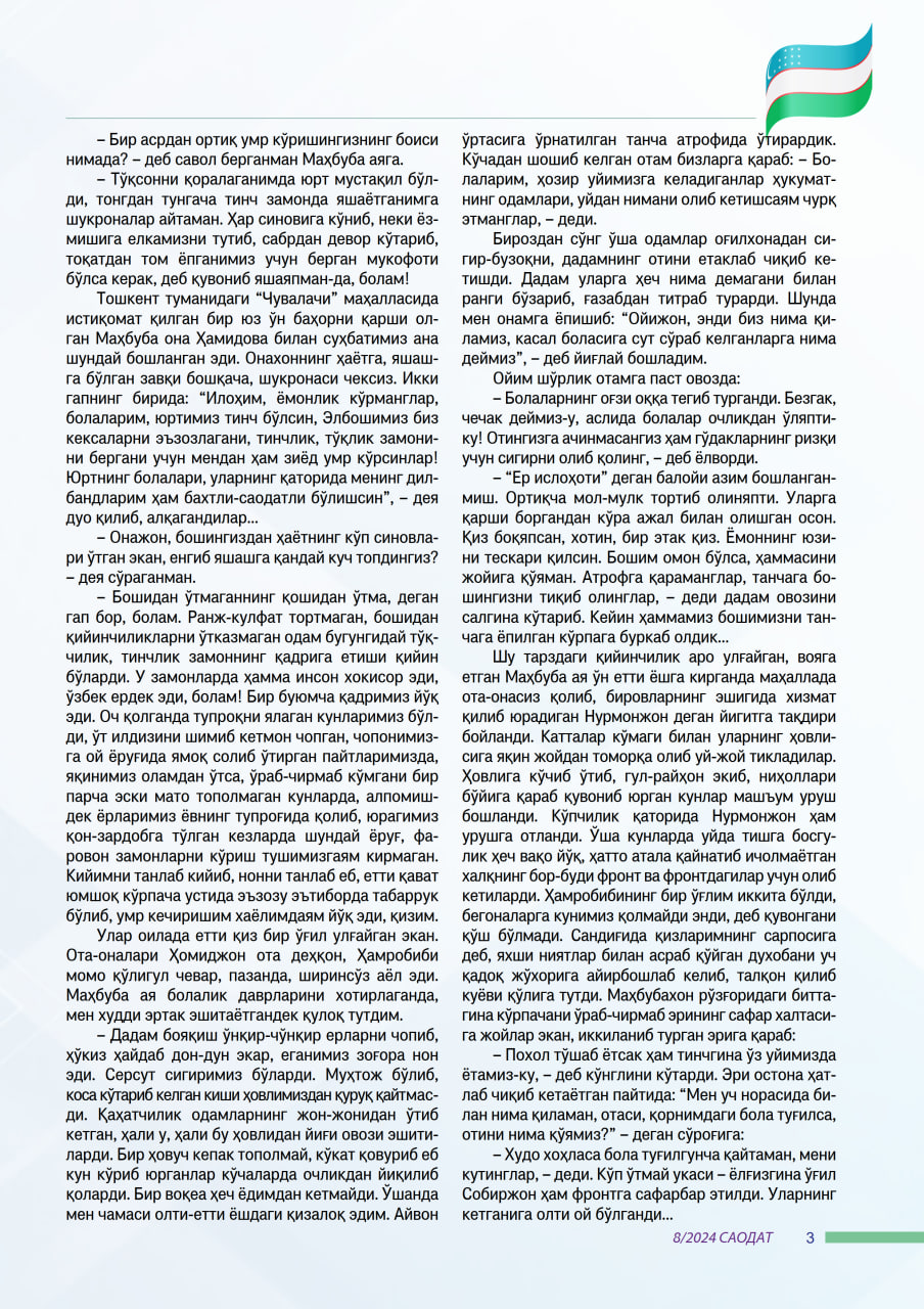 Бир неча йил аввал юз ёшдан зиёд умр кўрган табаррук момо билан суҳбат қилгандим. Ҳар йили Мустақиллик байрами арафасида раҳматли онахоннинг сўзлари бот-бот ёдимга келаверади. Яшаётган ҳаётим, давримдан кўнглимда заррача қониқмаслик пайдо бўлса, умидларим кучсизлана бошласа, дарҳол онахоннинг овозлари қулоғимда жаранглай бошлайди.