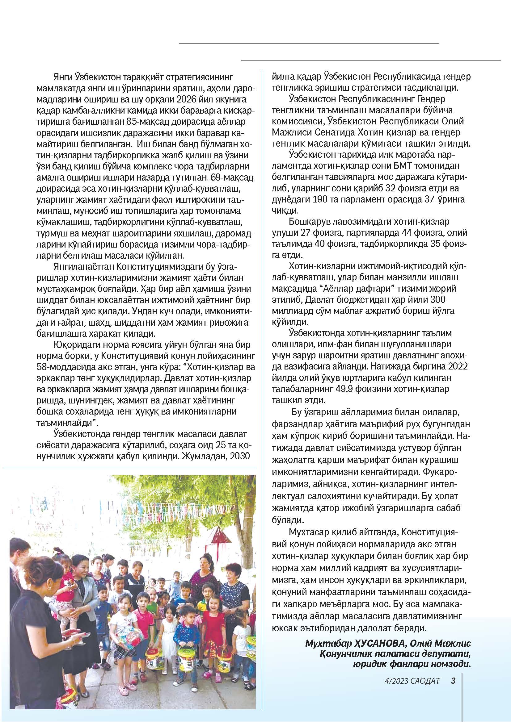 Янгиланаётган Конституциямиздаги бу ўзгаришлар хотин-қизларимизни жамият ҳаёти билан мустаҳкамроқ боғлайди. Ҳар бир аёл ҳамиша ўзини шиддат билан юксалаётган ижтимоий ҳаётнинг бир бўлагидай ҳис қилади. Ундан куч олади, имкониятидаги ғайрат, шахд, шиддатни ҳам жамият ривожига бағишлашга ҳаракат қилади.