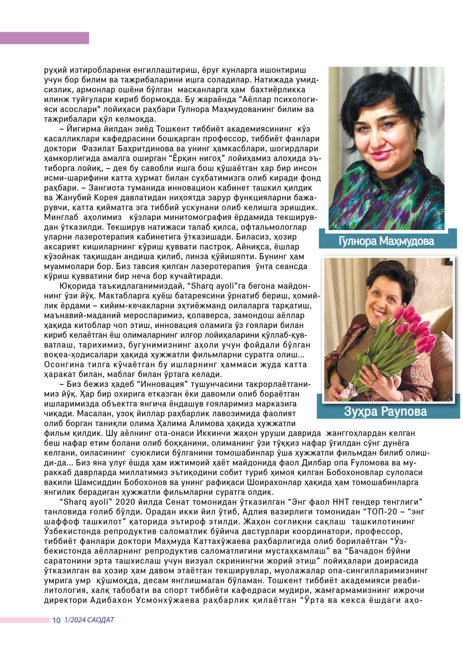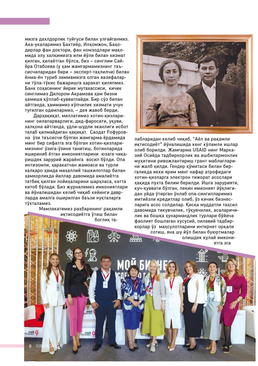 Дарҳақиқат, миллатимиз хотин-қизларининг оилапарварлиги, дид-фаросати, уқуви, халқона айтганда, удли-шудли эканлиги исбот талаб қилмайдиган ҳақиқат. Саодат Ғофуровна ўзи таъсисчи бўлган жамғарма ёрдамида минг бир сифатга эга бўлган хотин-қизларимизнинг ўзига-ўзини танитиш, ботинларида яшириниб ётган имкониятларини юзага чиқаришдек зарурий жараёнга восил бўлди. Опа интизомли, ҳаракатчан жамоаси ва турли халқаро ҳамда маҳаллий ташкилотлар билан ҳамкорликда йиллар давомида амалиётга татбиқ қилган лойиҳаларини шарҳласа, катта китоб бўлади. Биз журналимиз имкониятлари ва йўналишидан келиб чиқиб кейинги даврларда амалга оширилган баъзи нуқталарга тўхталамиз.
