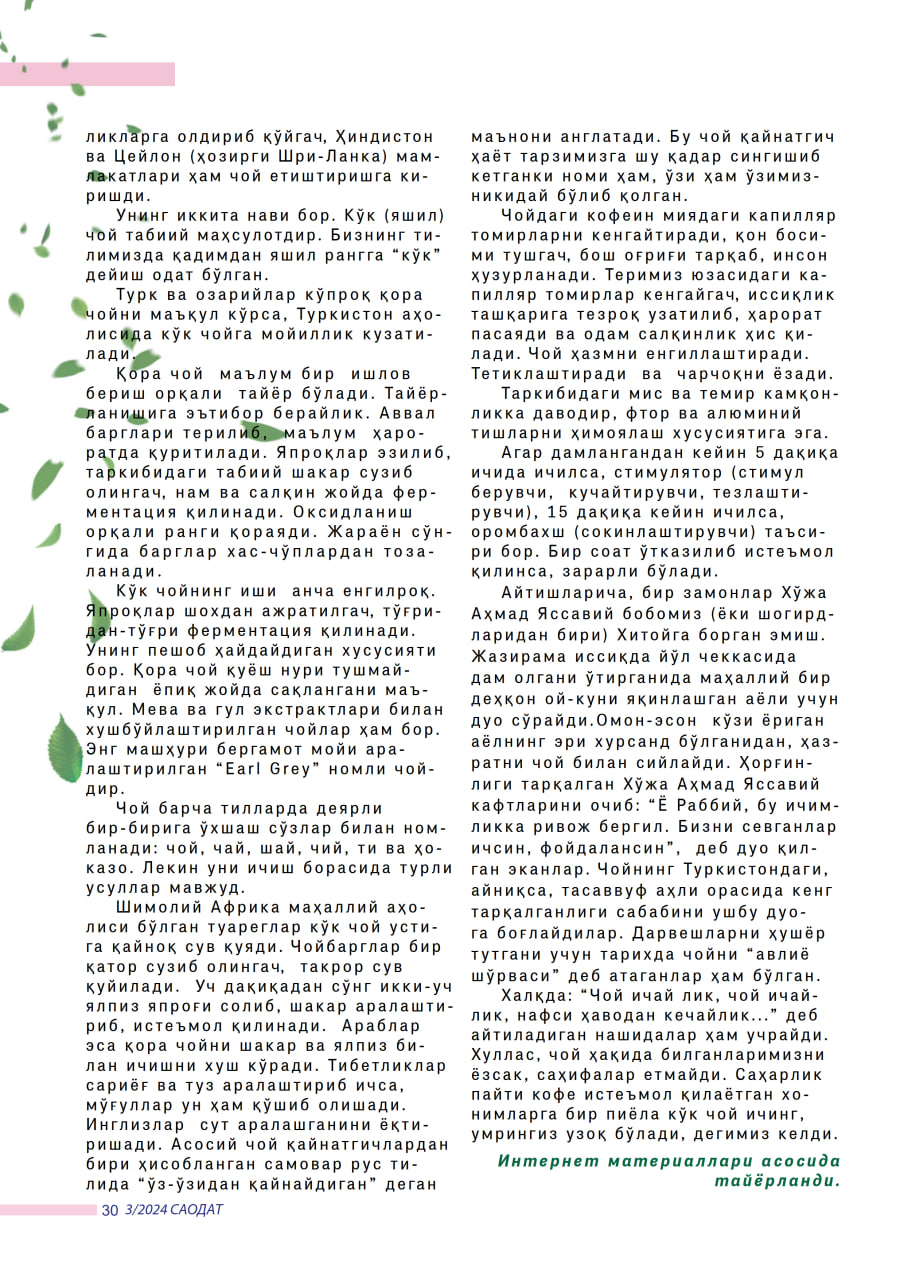 Халқда: “Чой ичай лик, чой ичайлик, нафси ҳаводан кечайлик...” деб айтиладиган нашидалар ҳам учрайди. Хуллас, чой ҳақида билганларимизни ёзсак, саҳифалар етмайди. Саҳарлик пайти кофе истеъмол қилаётган хонимларга бир пиёла кўк чой ичинг, умрингиз узоқ бўлади, дегимиз келди.
