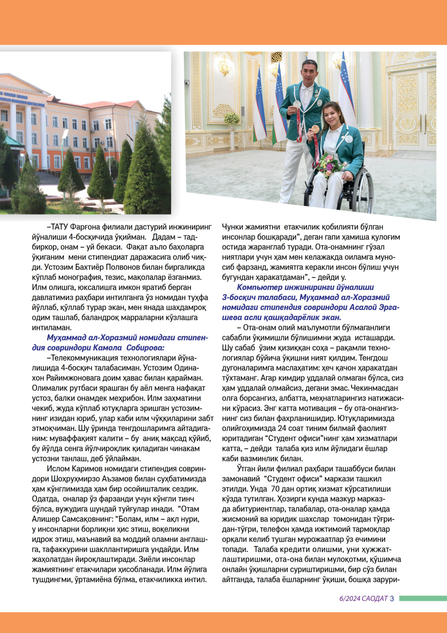 – ТАТУ Фарғона филиали дастурий инжиниринг йўналиши 4-босқичида ўқийман. Дадам – тадбиркор, онам – уй бекаси. Фақат аъло баҳоларга ўқиганим мени стипендиат даражасига олиб чиқди. Устозим Бахтиёр Полвонов билан биргаликда кўплаб монография, тезис, мақолалар ёзганмиз. Илм олишга, юксалишга имкон яратиб берган давлатимиз раҳбари интилганга ўз номидан туҳфа йўллаб, қўллаб турар экан, мен янада шахдамроқ одим ташлаб, баландроқ марраларни кўзлашга интиламан.