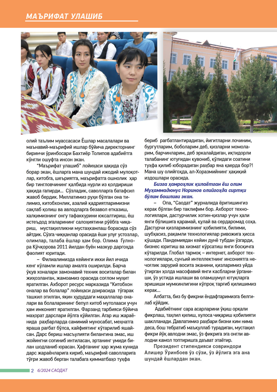 – Филиалимизда кейинги икки йил ичида кенг кўламли ишлар амалга оширилди. Барча ўқув хоналари замонавий техник воситалар билан жиҳозланган, жамоамиз орасида соғлом муҳит яратилган. Ахборот ресурс марказида “Китобхон оналар ва болалар” лойиҳаси доирасида тўгарак ташкил этилган, яқин ҳудуддаги маҳаллалар оналари ва болаларининг бепул китоб мутолааси учун ҳам имконият яратилган. Фарзанд тарбияси бўйича маҳорат дарслари йўлга қўйилган. Агар иш жараёнида раҳбарларда самимий муносабат, меҳнатга яраша рағбат бўлса, кайфиятинг кўтарилиб яшайсан. Дарс бериш масъулияти билангина эмас, иш жойингни соғиниб интиласан, эртанинг умиди билан шодланиб юрасан. Ҳафтанинг ҳар жума кунида дарс жараёнларига кириб, маърифий саволларига тўғри жавоб берган талабага қимматбаҳо туҳфа бериб рағбатлантирадиган, йигитларни лочиним, бургутларим, боболарим деб, қизларни момоларим, Барчинларим, деб эркалайдиган, иқтидорли талабанинг ютуғидан қувониб, қўлидаги соатини туҳфа қилиб юборадиган раҳбар яна қаерда бор?! Мана шу олийгоҳда, ал-Хоразмийнинг ҳақиқий издошлари орасида.