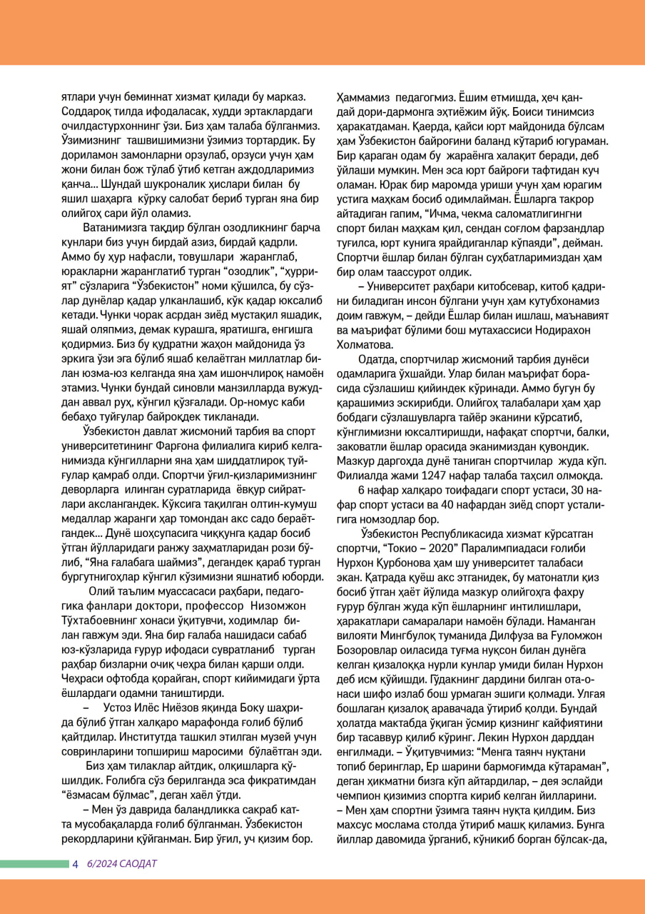 Ўзбекистон давлат жисмоний тарбия ва спорт университетининг Фарғона филиалига кириб келганимизда кўнгилларни яна ҳам шиддатлироқ туйғулар қамраб олди. Спортчи ўғил-қизларимизнинг деворларга илинган суратларида ёвқур сийратлари акслангандек. Кўксига тақилган олтин-кумуш медаллар жаранги ҳар томондан акс садо бераётгандек... Дунё шоҳсупасига чиққунга қадар босиб ўтган йўлларидаги ранжу заҳматларидан рози бўлиб, “Яна ғалабага шаймиз”, дегандек қараб турган бургутнигоҳлар кўнгил кўзимизни яшнатиб юборди.