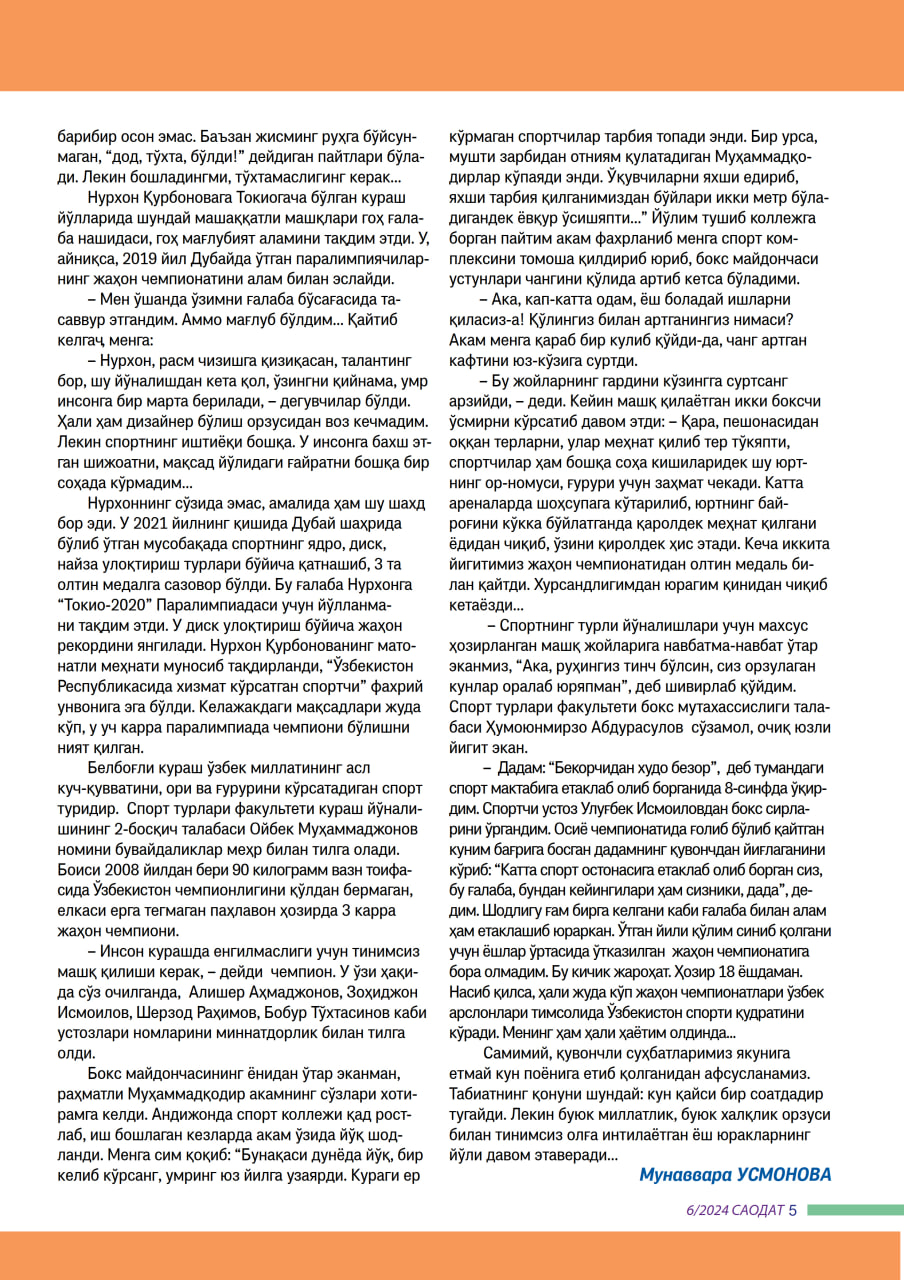 – Дадам: “Бекорчидан худо безор”, деб тумандаги спорт мактабига етаклаб олиб борганида 8-синфда ўқирдим. Спортчи устоз Улуғбек Исмоиловдан бокс сирларини ўргандим. Осиё чемпионатида ғолиб бўлиб қайтган куним бағрига босган дадамнинг қувончдан йиғлаганини кўриб: “Катта спорт остонасига етаклаб олиб борган сиз, бу ғалаба, бундан кейингилари ҳам сизники, дада”, дедим. Шодлигу ғам бирга келгани каби ғалаба билан алам ҳам етаклашиб юраркан. Ўтган йили қўлим синиб қолгани учун ёшлар ўртасида ўтказилган жаҳон чемпионатига бора олмадим. Бу кичик жароҳат. Ҳозир 18 ёшдаман. Насиб қилса, ҳали жуда кўп жаҳон чемпионатлари ўзбек арслонлари тимсолида Ўзбекистон спорти қудратини кўради. Менинг ҳам ҳали ҳаётим олдинда...