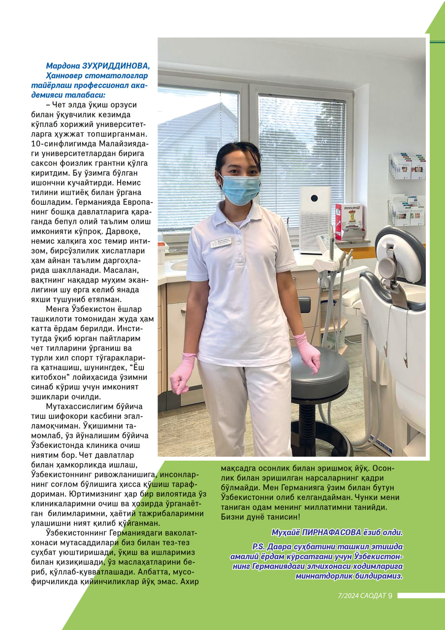 – Талабалик давримдаёқ Германия медицина соҳасида дунёда энг етакчи давлат экани тўғрисида кўп эшитгандим. Шу тариқа “дойче пунктлайхет” – “пухталик ва аниқлик” русум бўлган диёрга бориб ўқиш орзуси пайдо бўлди. Мақсадга етиш учун ҳаракатни мустақил тайёрланишдан бошлаб, кейинроқ немис тили курсларига борганман. 2022 йилда, ниҳоят, ушбу мамлакатга келишга муваффақ бўлдим. Дастлабки иш кунларим бироз қийин кечди. Лекин астойдил ҳаракат қилиб, ҳамкасбларнинг ёрдами билан бу қийинчиликларни енгиб ўтдим.