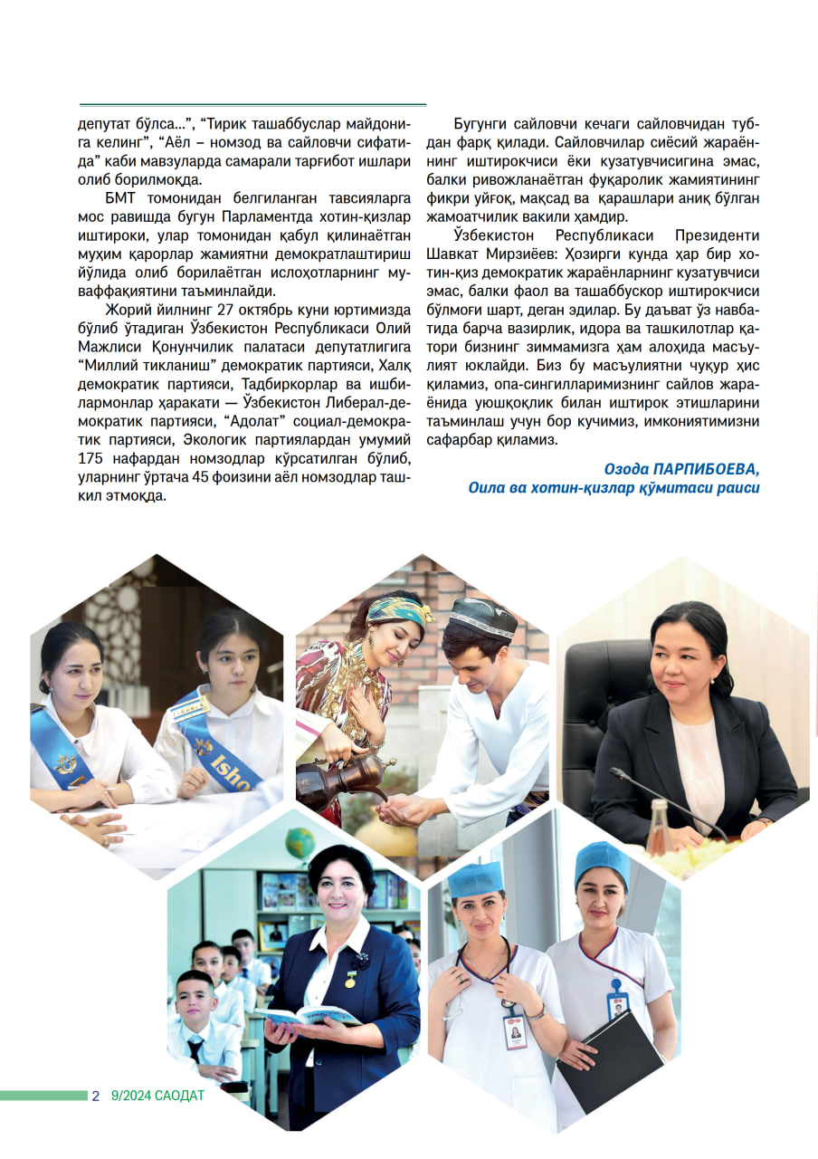 Ўзбекистон Республикаси Президенти Шавкат Мирзиёев: Ҳозирги кунда ҳар бир хотин-қиз демократик жараёнларнинг кузатувчиси эмас, балки фаол ва ташаббускор иштирокчиси бўлмоғи шарт, деган эдилар. Бу даъват ўз навбатида барча вазирлик, идора ва ташкилотлар қатори бизнинг зиммамизга ҳам алоҳида масъулият юклайди. Биз бу масъулиятни чуқур ҳис қиламиз, опа-сингилларимизнинг сайлов жараёнида уюшқоқлик билан иштирок этишларини таъминлаш учун бор кучимиз, имкониятимизни сафарбар қиламиз.