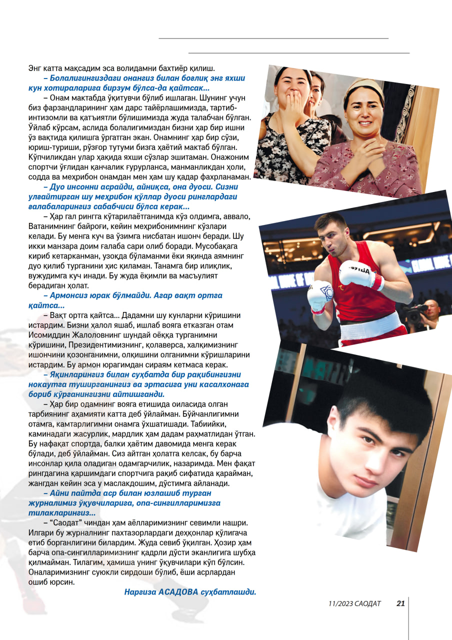 – Ҳар гал рингга кўтарилаётганимда кўз олдимга, аввало, Ватанимнинг байроғи, кейин меҳрибонимнинг кўзлари келади. Бу менга куч ва ўзимга нисбатан ишонч беради. Шу икки манзара доим ғалаба сари олиб боради. Мусобақага кириб кетарканман, узоқда бўламанми ёки яқинда аямнинг дуо қилиб турганини ҳис қиламан. Танамга бир илиқлик, вужудимга куч инади. Бу жуда ёқимли ва масъулият берадиган ҳолат.