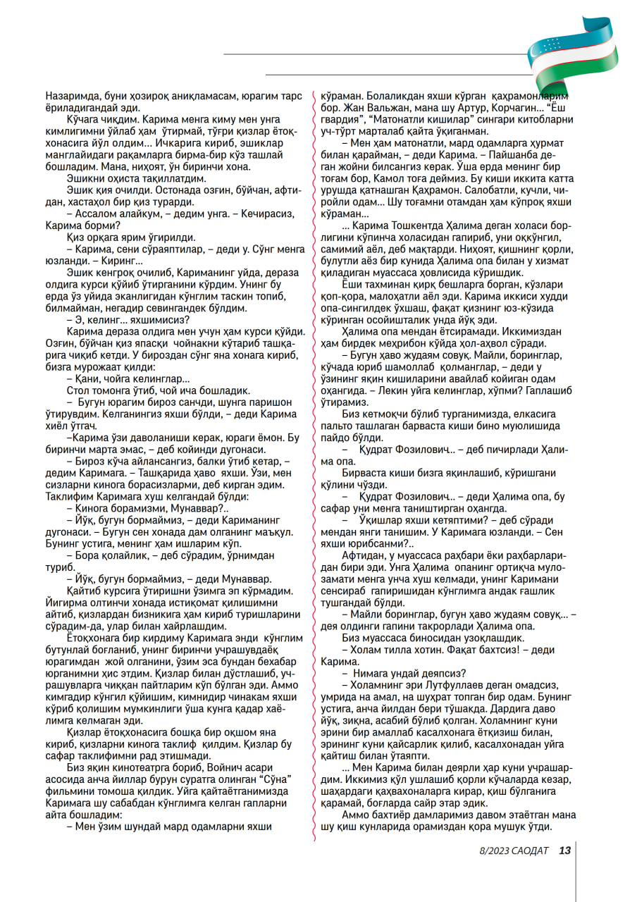– Йўқ, бугун бормаймиз, – деди Кариманинг дугонаси. – Бугун сен хонада дам олганинг маъқул. Бунинг устига, менинг ҳам ишларим кўп.