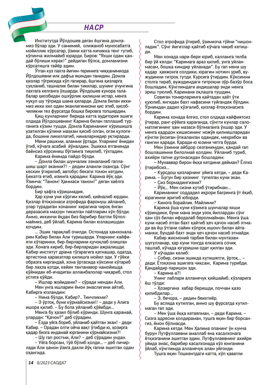 – Домла билан шунчалик эзмаланиб гаплашиш шарт эканми?! – дедим аламли оҳангда. Сўнг кескин ўгирилиб, автобус бекати томон кетдим. Бекатга етиб, изимга қарадим: Карима йўқ эди. Ўзимча: “Тамом! Ҳаммаси тамом!” деган хаёлга бордим.