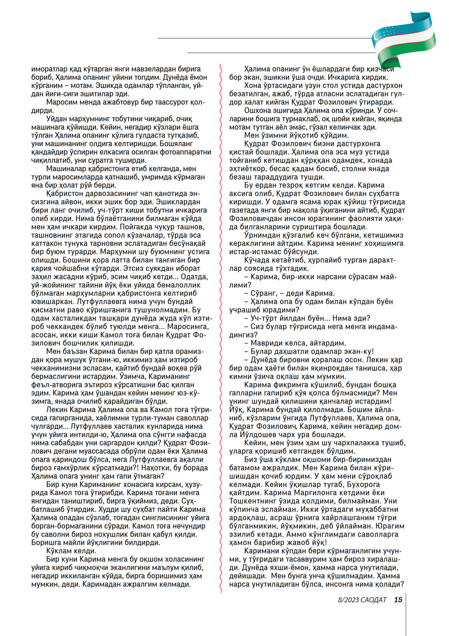 Лекин Карима Ҳалима опа ва Камол тоға тўғрисида гапирганида, хаёлимни турли-туман саволлар чулғарди... Лутфуллаев хасталик кунларида нима учун уйига интилди-ю, Ҳалима опа сўнгги нафасда нима сабабдан уни саргардон қилди? Қудрат Фозилович дегани муассасада обрўли одам ёки Ҳалима опага қариндош бўлса, нега Лутфуллаевга ақалли бироз ғамхўрлик кўрсатмади?! Наҳотки, бу борада Ҳалима опага унинг ҳам гапи ўтмаган?
