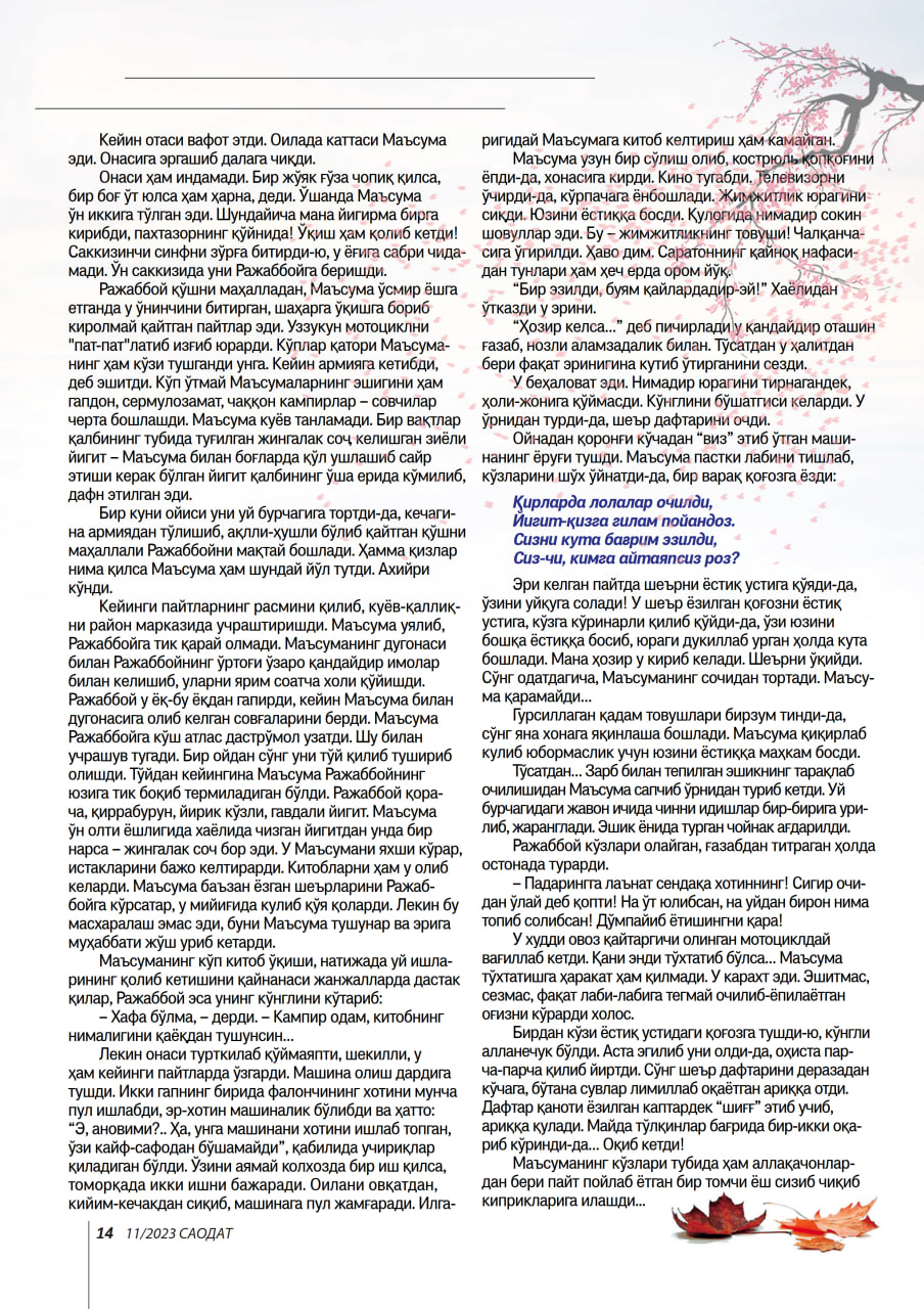 “Э, бугун Саври холаникида маърака-ку! Кечки ўтиришга жўнагандир, қайтмайди энди!” Маъсуманинг оёғи илдамлашиб, чарчоғи тарқаб кетди. Чироқни ёқиб, тугунини сўрига қўйди. Сўнг яна қайнонам келиб қолса, хархаша қилмасин, деган мулоҳазага борди-да, тугун ичидаги китобни тўшак тагига яширди. Тушликдан ортган нонни қаёқдандир етиб келиб, кўзларини мўлтиратиб турган пахмоқ кучукка ташлади. Этигини айвонга ечиб, келинлик хонасига кирди. Кенггина, токчаванд хона дид билан безатилган эди. Тўрдаги меҳробга қўйилган нақшдор сандиқ устига духоба, атлас кўрпачалар тахланган, қозиқларга ҳар хил гуллар тикилган сочиқлар илиғлиқ. Хона четида ичи чинни идиш-товоқларга лиқ тўла жавон. Полга гилам тўшалган. Токчалардан бирига "Кварц" телевизори ўрнатилган.
