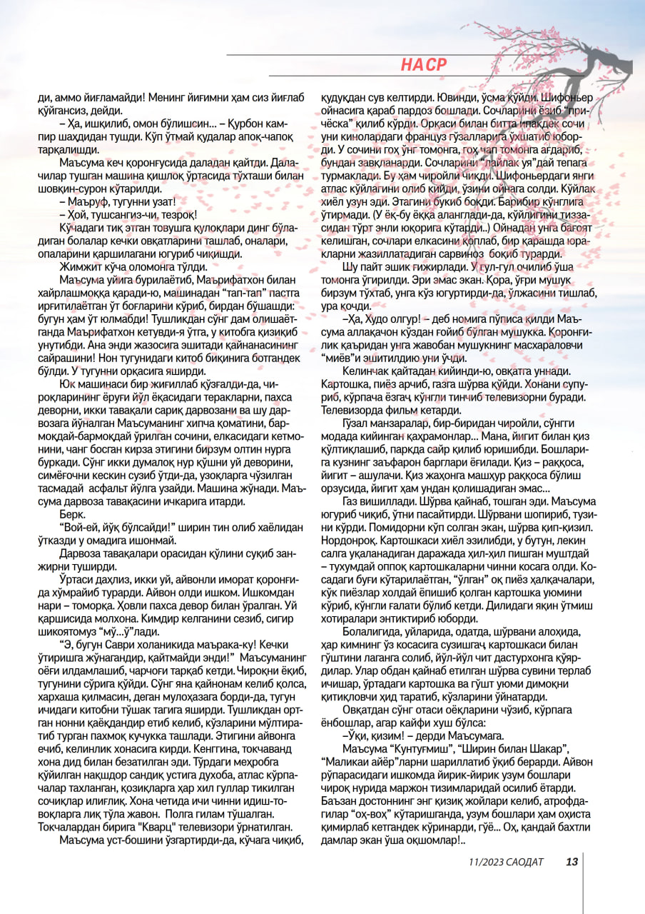 Маъсума узун бир сўлиш олиб, кострюль қопқоғини ёпди-да, хонасига кирди. Кино тугабди. Телевизорни ўчирди-да, кўрпачага ёнбошлади. Жимжитлик юрагини сиқди. Юзини ёстиққа босди. Қулоғида нимадир сокин шовуллар эди. Бу – жимжитликнинг товуши! Чалқанчасига ўгирилди. Ҳаво дим. Саратоннинг қайноқ нафасидан тунлари ҳам ҳеч ерда ором йўқ.
