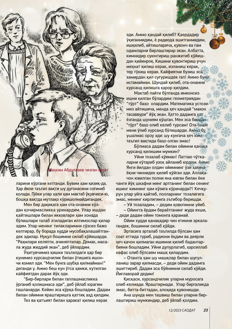 Негалигини билмайман, чунки Янги йилни қайсидир танишлариникида кутишган ва уйга жуда кеч қайтишган эди. Тонгда эса бир-бирлари билан гаплашмай қўйишди. Энг ёмони – шу! Ундан кўра бақир-чақир қилиб уришиб, кейин ярашиб олишгани яхши эди. Йўқ, бу сафар қандайдир бошқача. Уйда жимлик ҳукмрон. Ҳатто, бир-бирига қарашмайди ҳам. Мени ҳар қадамимда тартибга чақириб турадиган ойим, гоҳи хафа қилиб қўйса бағрига босиб эркалайдиган дадам ҳам менга бегонадек қарайди. Вазиятни билиб турибман, нимадир бўлган. Бу “нимадир” қачон тугашиниям билиб бўлмайди! Ахир, улар гаплашишмаяпти! Худди касаллик давридек… Агар, бирдан ҳарорат кўтарилиб, қирққа чиқиб кетса ҳам хавотирга ўрин йўқ – дори-дармонлар билан уни туширса бўлади. Умуман, менинг фикримча, ҳарорат қанча баланд бўлса, касалликни аниқлаш шунчалик осон. Даволаш ҳам. Бир куни доктор менга ўйчан тикилиб, ойимга: “ҳарорати ўртача”, дегани менга ёқмаган. Тузалиш ўрнига ўзимни ёмон ҳис қила бошлаганман. Умуман олганда, қишки таътилнинг биринчи куни шу қадар тинч ва сокин ўтдики, арчанинг ёнига бориб гаплашгим келди.