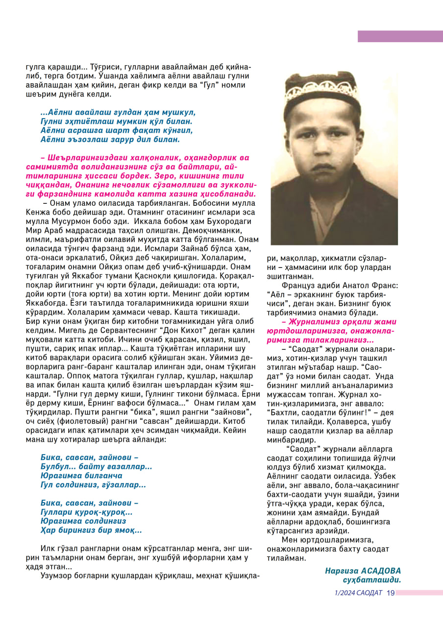 “Саодат” журнали аёлларга саодат соҳилини топишида йўлчи юлдуз бўлиб хизмат қилмоқда. Аёлнинг саодати оиласида. Ўзбек аёли, энг аввало, бола-чақасининг бахти-саодати учун яшайди, ўзини ўтга-чўққа уради, керак бўлса, жонини ҳам аямайди. Бундай аёлларни ардоқлаб, бошингизга кўтарсангиз арзийди.
