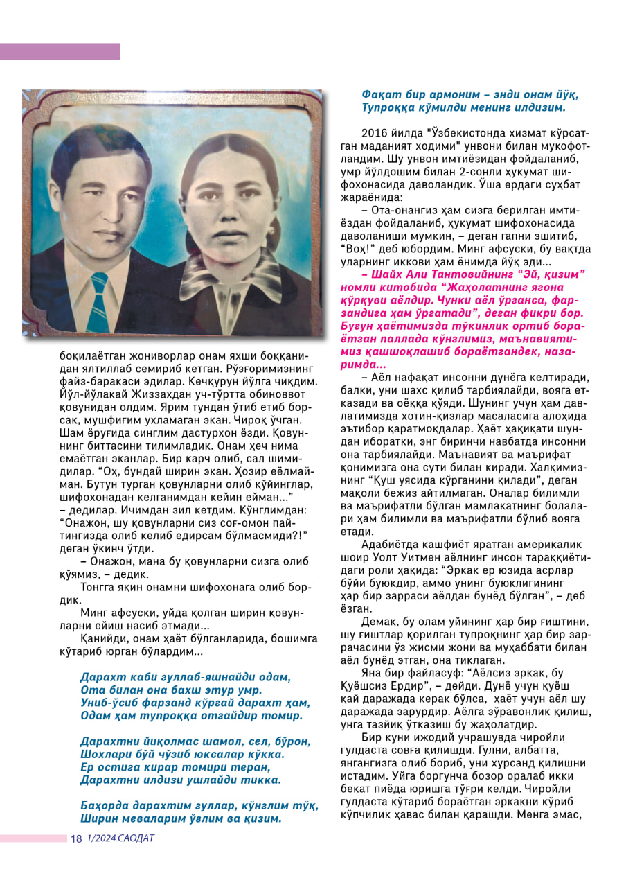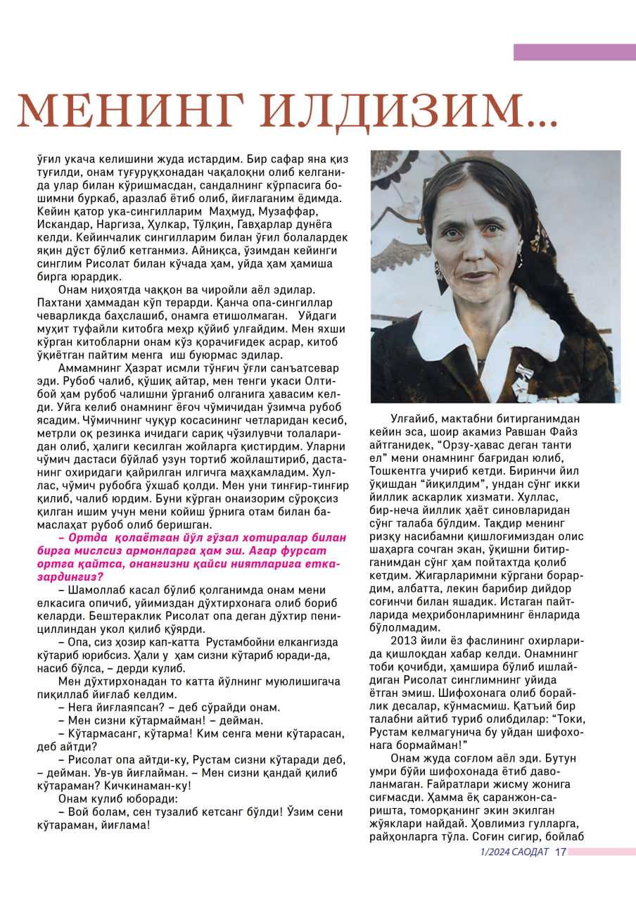 – Журналимиз орқали жами юртдошларимизга, онажонларимизга тилакларингиз...