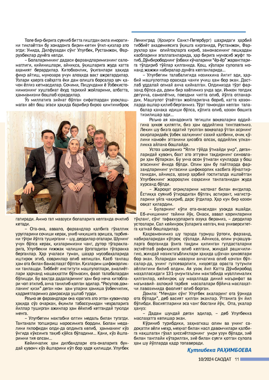 Кейинчалик ҳам дилбандлари ота-оналарига бундай қувонч кўз ёшларини кўп бор ҳадя қилишди. Улуғбек Ленинград (Ҳозирги Санкт-Петербург) шаҳридаги ҳарбий тиббиёт академиясига ўқишга кирганида, Рустамжон, Фаррухлар ҳам олийгоҳларга кириб, замонасининг пешқадам касбларини эгаллаганларида, ҳар бирига муносиб жуфт топиб, Дўмбирободнинг ўзбаки кўчаларини “ёр-ёр” жарангларига тўлдириб тўйлар қилганида. Қош, кўзлари сулолага монанд жажжи набиралар дунёга келганларида...