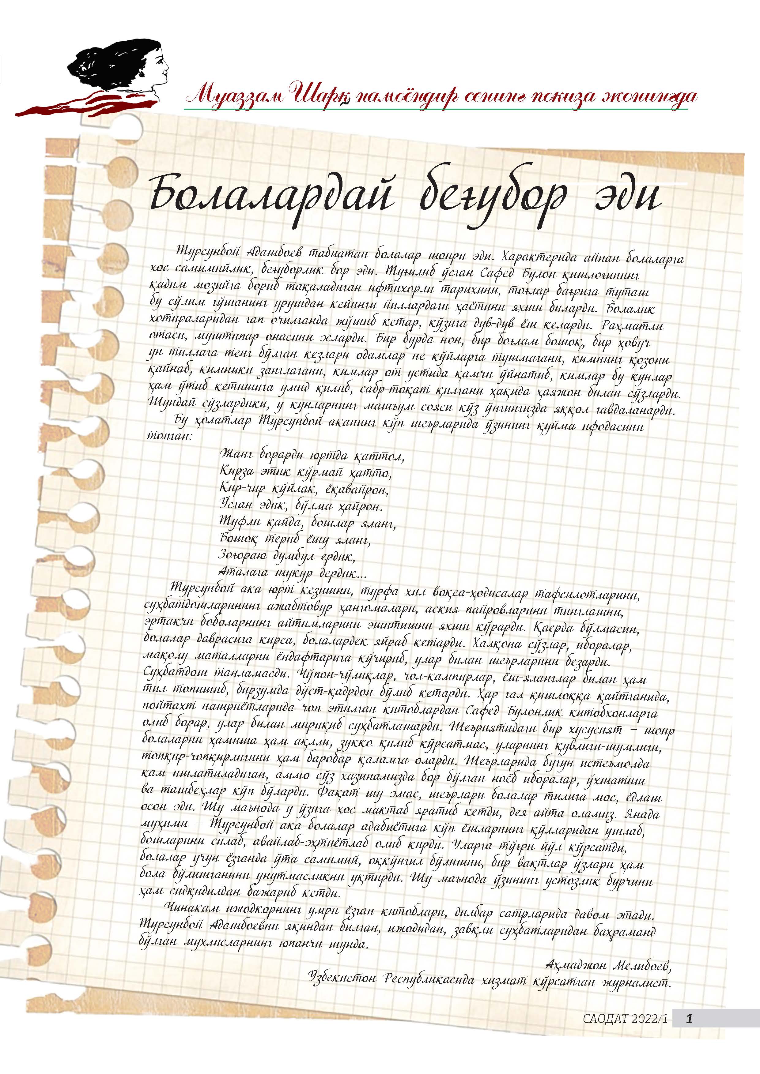 Маълумот: Турсунбой Адашбоев (1939-2017) 1939 йилнинг 1 январида таваллуд топган. Унинг “Камолнинг олмаси” деб номланган биринчи китоби 1966 йилда чоп этилган.