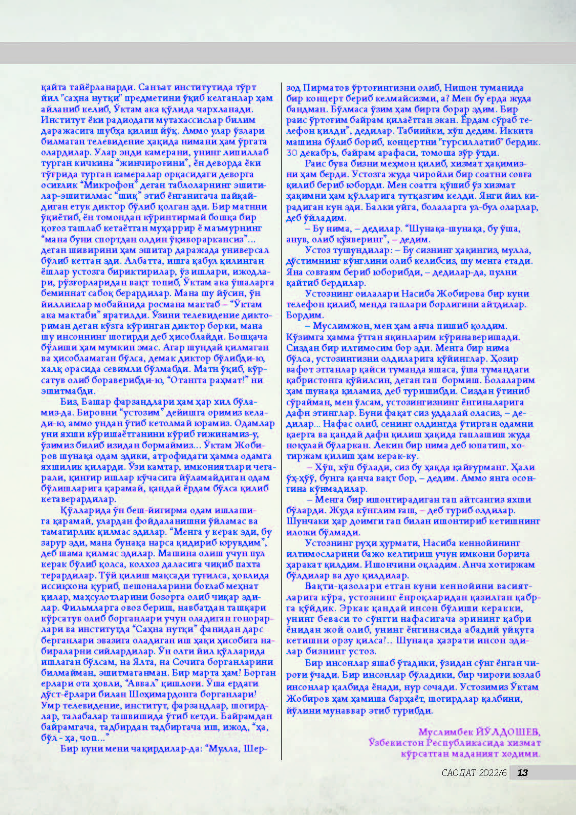 Биз, Башар фарзандлари ҳам ҳар хил бўламиз-да. Бировни “устозим” дейишга оримиз келади-ю, аммо ундан ўтиб кетолмай юрамиз. Одамлар уни яхши кўришаётганини кўриб ғижинамиз-у, ўзимиз билиб изидан бормаймиз... Ўктам Жобиров шунақа одам эдики, атрофидаги ҳамма одамга яхшилик қиларди. Ўзи камтар, имкониятлари чегарали, қинғир ишлар кўчасига йўламайдиган одам бўлишларига қарамай, қандай ёрдам бўлса қилиб кетаверардилар.