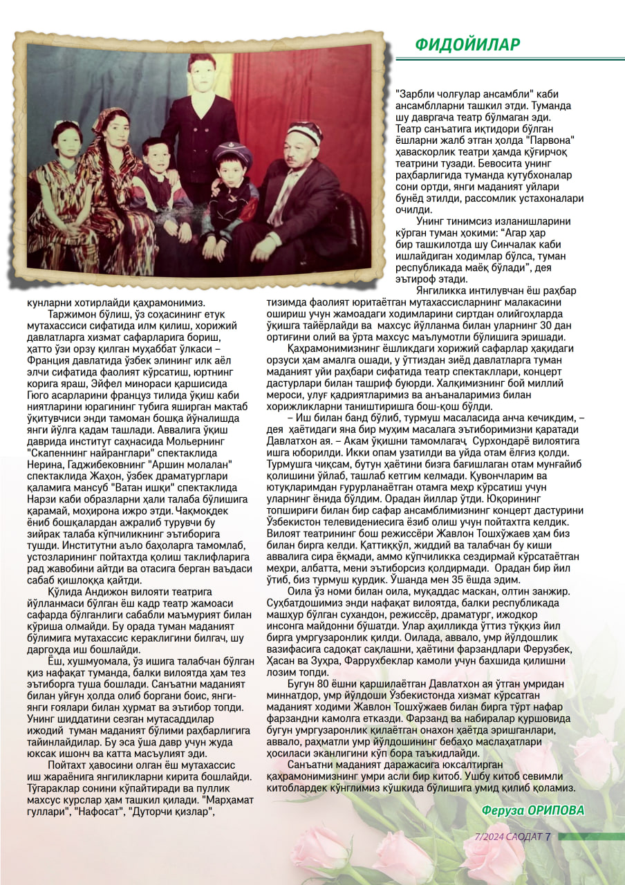 – Ўн уч нафар талабанинг ўн тўртинчиси бўлиб сентябрдан ўқишни бошладим. Тенгдошларим билан тез киришиб кетдим, фанларни ҳам ўзлаштириб олдим. Устозларим Надежда Павлова ҳамда Омон Абдураззоқовларга савол беравериб, тинч қўймасдим. Кейинги йили курсимизга гуруҳ сардори қилиб тайинлашди ва менда ўзимга бўлган ишонч янада ошди, – дея ўша кунларни хотирлайди қаҳрамонимиз.