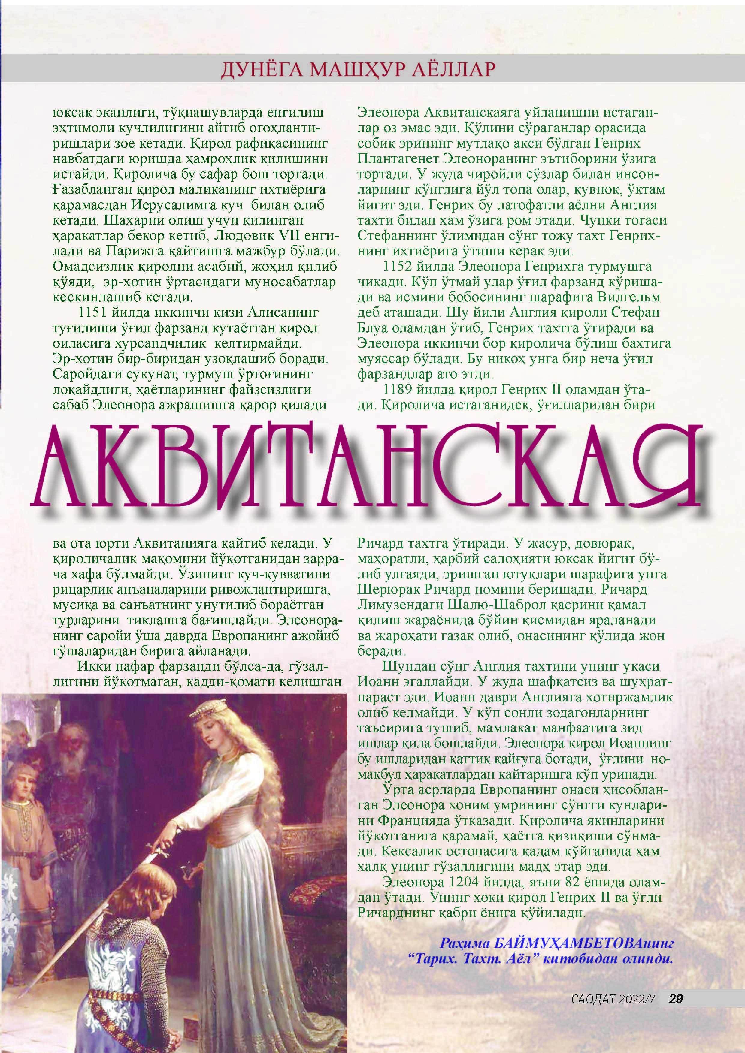 Ўз даврида бутун Европанинг сиёсий ҳаётида муҳим шахс ҳисобланган Элеонора Аквитанская икки бора қироличалик мақомини олишга муваффақ бўлган машҳур аёлдир.