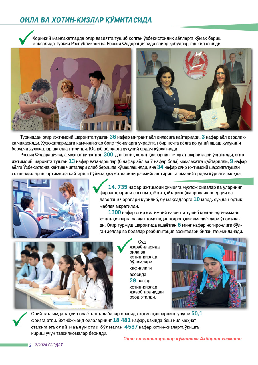 1300 нафар оғир ижтимоий вазиятга тушиб қолган эҳтиёжманд хотин-қизларга давлат томонидан жарроҳлик амалиётлари ўтказилади. Оғир турмуш шароитида яшаётган 6 минг нафар ногиронлиги бўлган аёллар ва болалар реабилитация воситалари билан таъминланади.