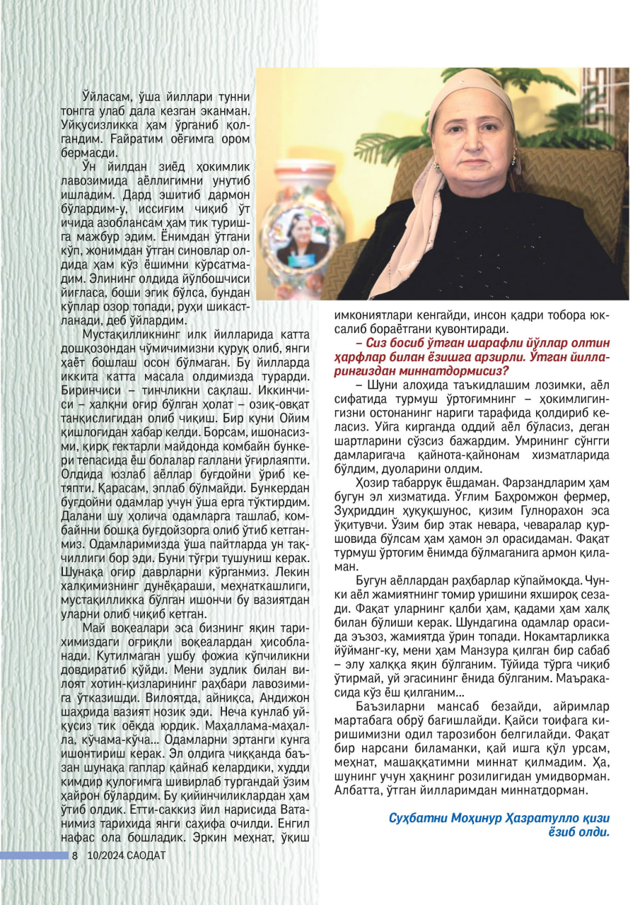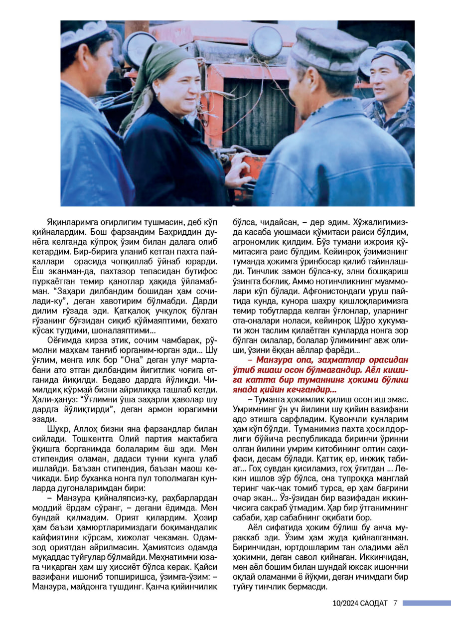 – Манзура опа, заҳматлар орасидан ўтиб яшаш осон бўлмагандир. Аёл кишига катта бир туманнинг ҳокими бўлиш янада қийин кечгандир...