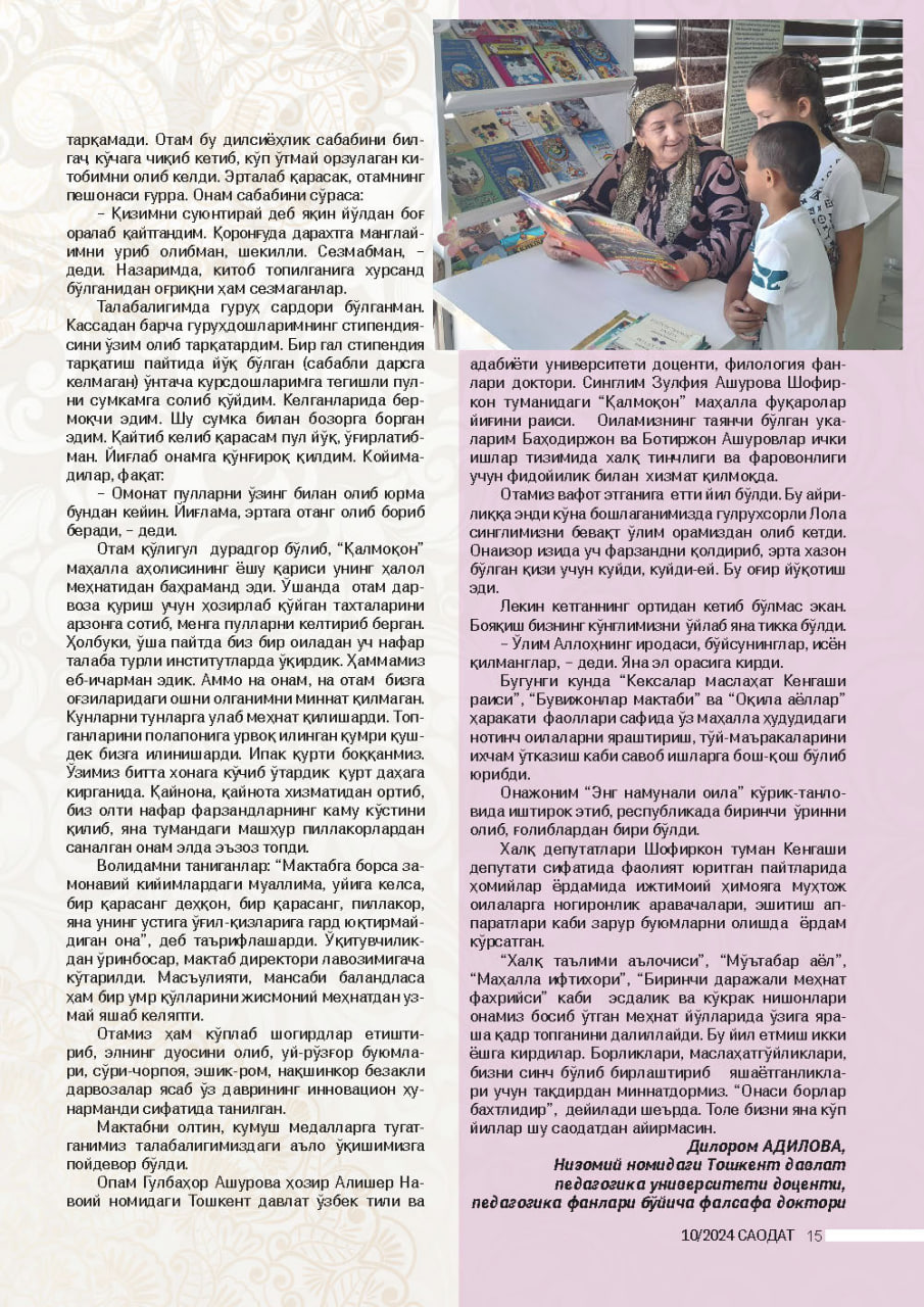 “Халқ таълими аълочиси”, “Мўътабар аёл”, “Маҳалла ифтихори”, “Биринчи даражали меҳнат фахрийси” каби эсдалик ва кўкрак нишонлари онамиз босиб ўтган меҳнат йўлларида ўзига яраша қадр топганини далиллайди. Бу йил етмиш икки ёшга кирдилар. Борликлари, маслаҳатгўйликлари, бизни синч бўлиб бирлаштириб яшаётганликлари учун тақдирдан миннатдормиз. “Онаси борлар бахтлидир”, дейилади шеърда. Толе бизни яна кўп йиллар шу саодатдан айирмасин.