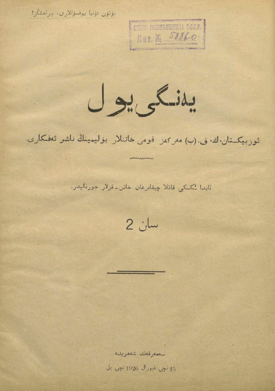 «Саодат» (ўша даврдаги номи – «Янги йўл» деб аталган) журналининг 1926 йилги № 2-сони. Муҳаррири – Фотима Ниёзова.