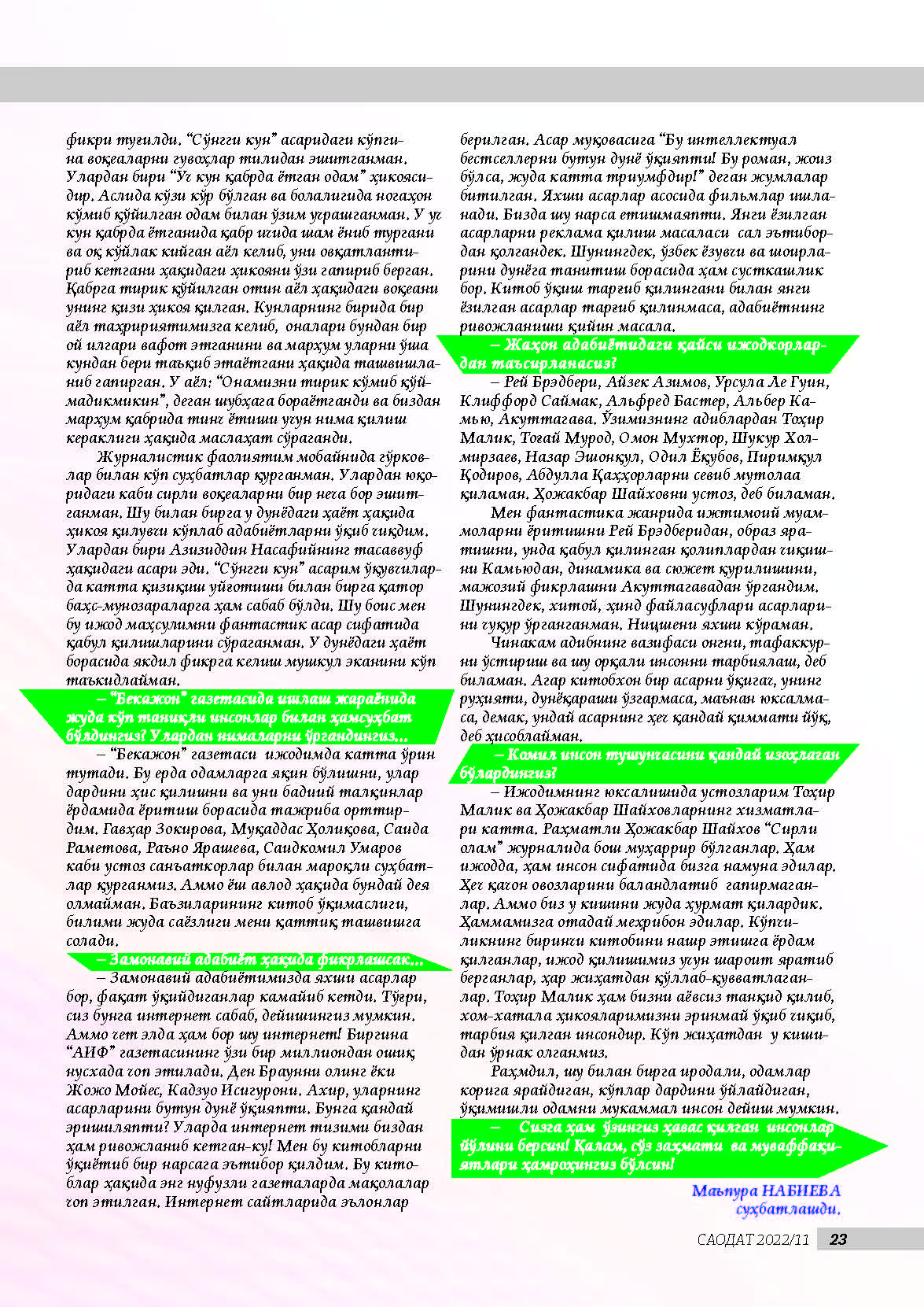 - “Бекажон” газетасида ишлаш жараёнида жуда кўп таниқли инсонлар билан ҳамсуҳбат бўлдингиз? Нималарнидир улардан ўргандингиз, қайси жиҳатларига тан бердингиз?