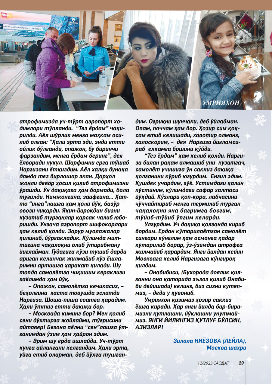 Бухоро шаҳар “Бахт” кўчасида туғилганман. Тақдир экан, 22 йилдан бери Москвада яшайман. Домодедово аэропортига қарашли “борт егуликлари” фабрика-ошхонасида бош кондитер бўлиб ишлайман. Иш фаолиятимни идиш-товоқ ювишдан бошлаганман. Аллоҳ менинг ризқимни юртимдан, Ватаним, яқинларимдан узоқда берган экан. Нимаям дейман, берганига шукур! Лекин ҳар йили Янги йил байрамини Ўзбекистонда, ота уйимда кутиб олишга ҳаракат қиламан. “Саодат” журналининг доимий мухлисиман. Журнал сайтига кириб ўқиш бошқа, қўлда ушлаб саҳифаларини ҳидлаб ўқиган бошқа, деб яқинларим келса китоб ва журнал олиб келишларини илтимос қиламан. Мен “Эсда қолган янги йил” лойиҳангизга бошимдан ўтган бир воқеани ёзиб юборяпман.