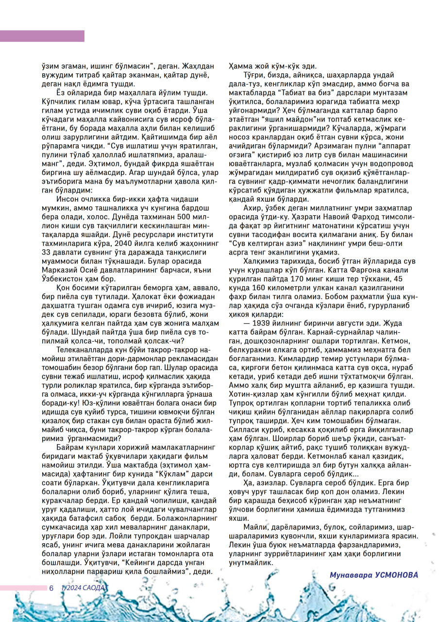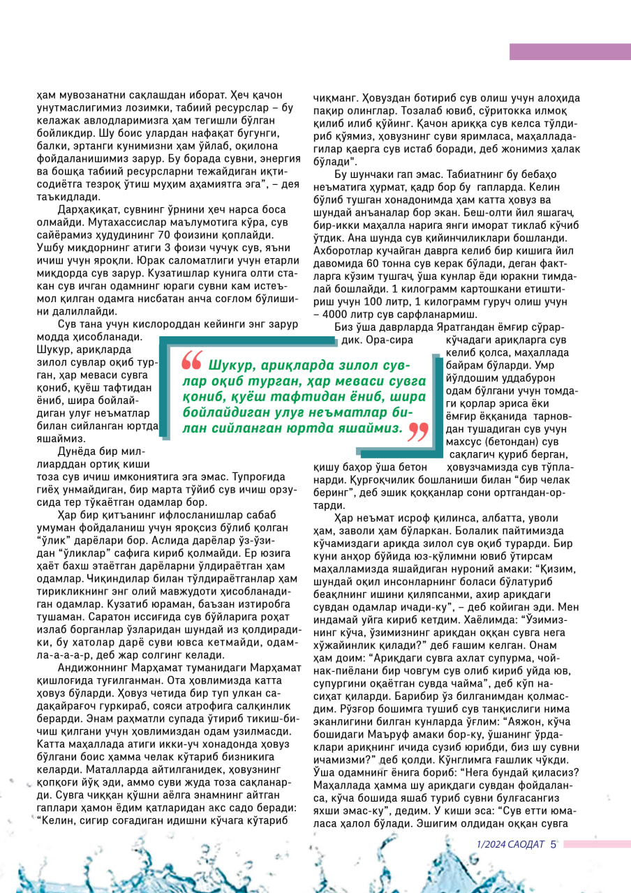 Юртнинг бир ижодкор қизи сифатида йил бошида гулдан гапирсам, нурдан ёзсам бўларди. Йўқ, мен СУВ ҳақида сўзлагим келди. Мендан аввал ҳам кўп алломалар, олим ва мутахассислар, устоз адиблар бу мавзуда жон куйдириб гапирган, ёзган. Элнинг тили учига келиб турган зарур гапни қанча кўп одам айтиб, ёзса, фойдага ишлайди. Шунинг учун кўнглимда тўр бойлаганларини қоғозга туширишни истадим. Давлатимиз раҳбарининг 4 январь куни сувдан самарали фойдаланиш борасида ўтказган йиғилишида муҳокама қилинган масалалар ҳам шунга ундади.